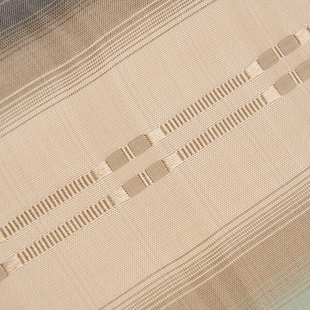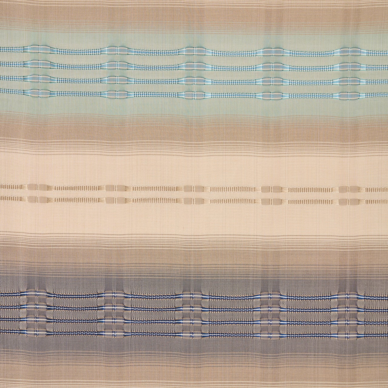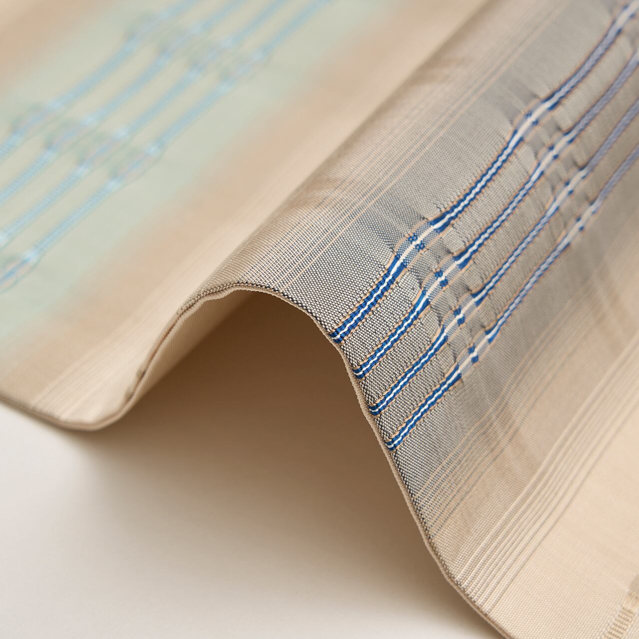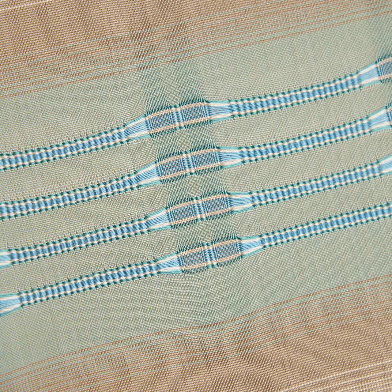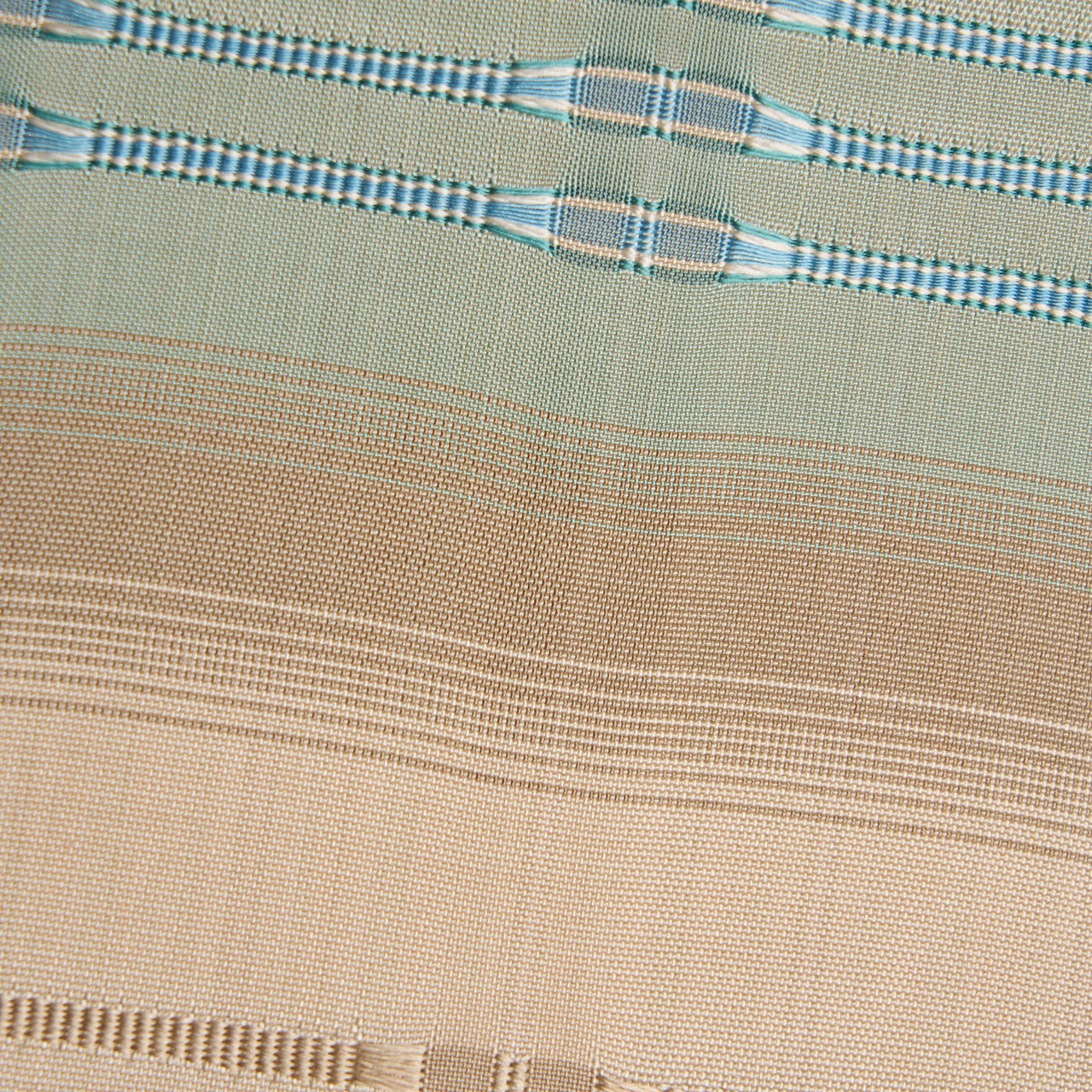 淡く綺麗なクリーム色・練色の地に段暈しが取られ、ひとつは緑味のある淡いブルー・白群色を挟んで灰汁色が置かれて儚げな暈しを織り出されて、もうひとつは利休色を挟んでやはり同系色の灰汁色で暈しが織り出され、それぞれの中心に吉野間道が織り込まれて、素敵なアクセントとなった、お洒落な九寸名古屋帯です。