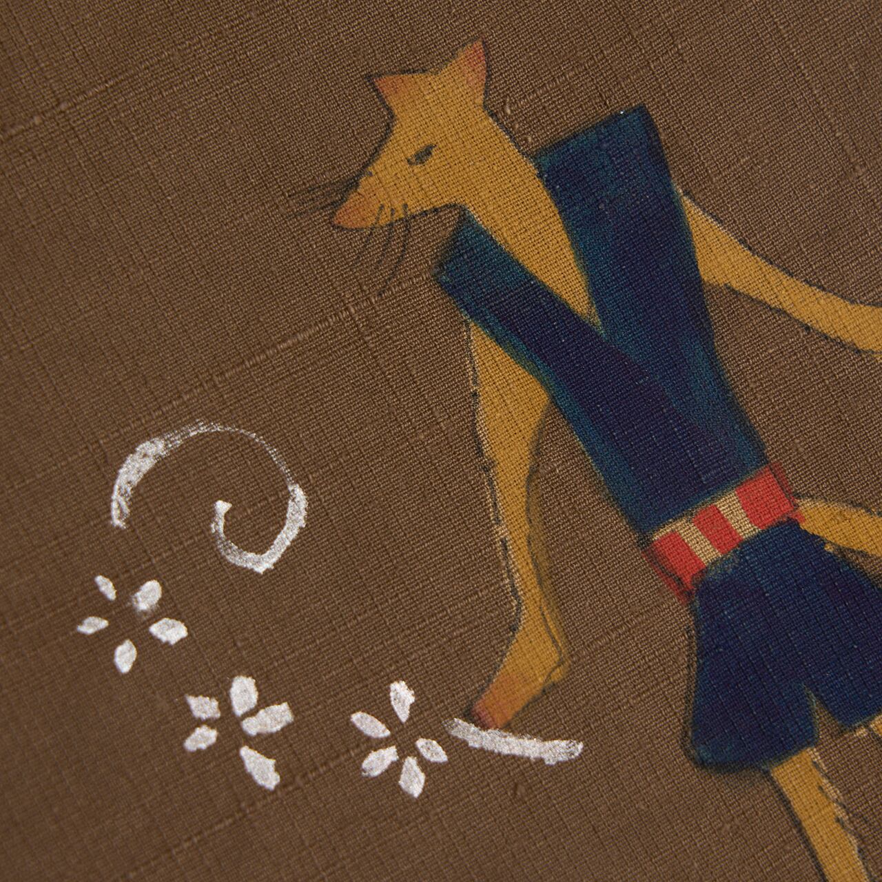 地染めは紀絵さんの作品としては珍しい焦げ茶・涅色が使われていますが、夕暮れ時なのか、これから夜に向けてお祭りが盛りあがっていくところなのかしら、などと想像してしまいます。