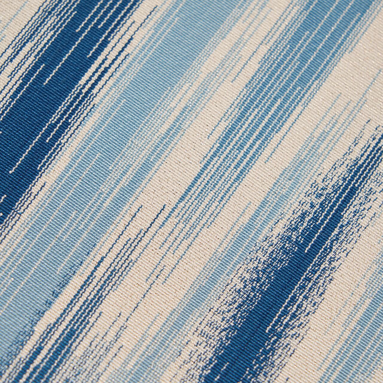 象牙色の白が綺麗な地の織に、浅縹色、藍色、深縹色の3段階の藍の濃淡で、流れるように美しい線の霞模様が織り出された、爪掻き綴れの八寸名古屋帯の作品です。