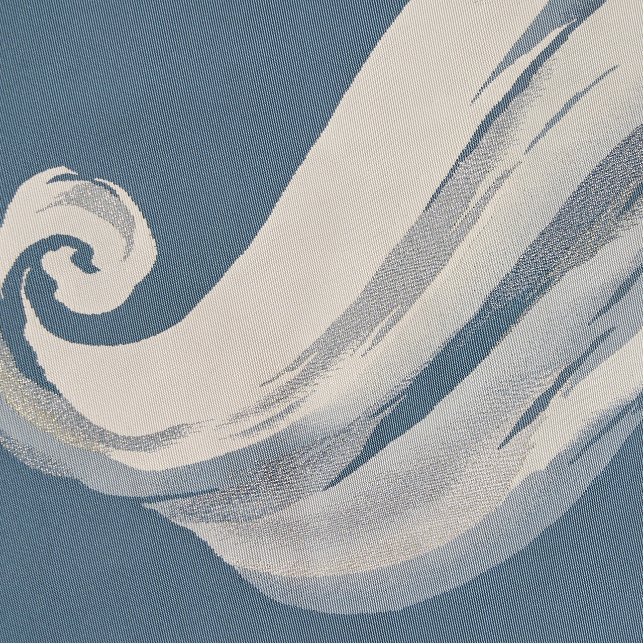 爪掻き綴れでとても丁寧に織られていますが、お太鼓には雲のような、風のような模様が白と極細の銀糸と淡い水色・秘色色で、前柄にはやはり極細の金糸で稲妻のような細い線が織り出されています。