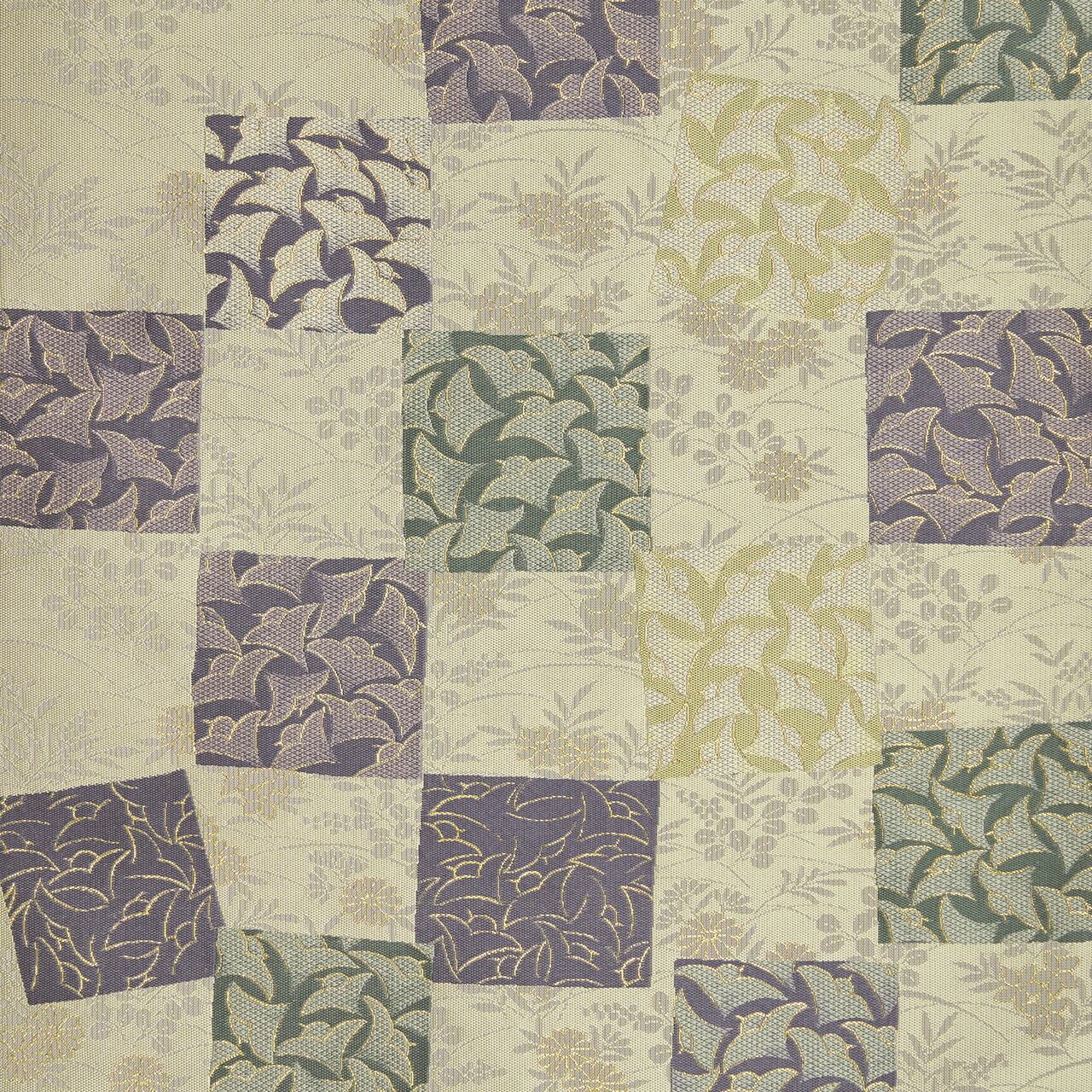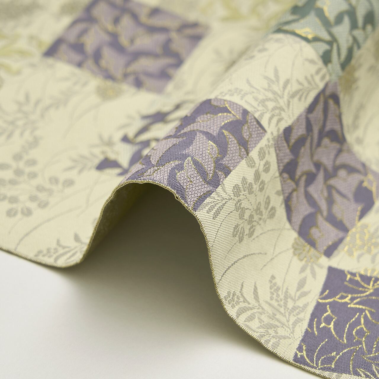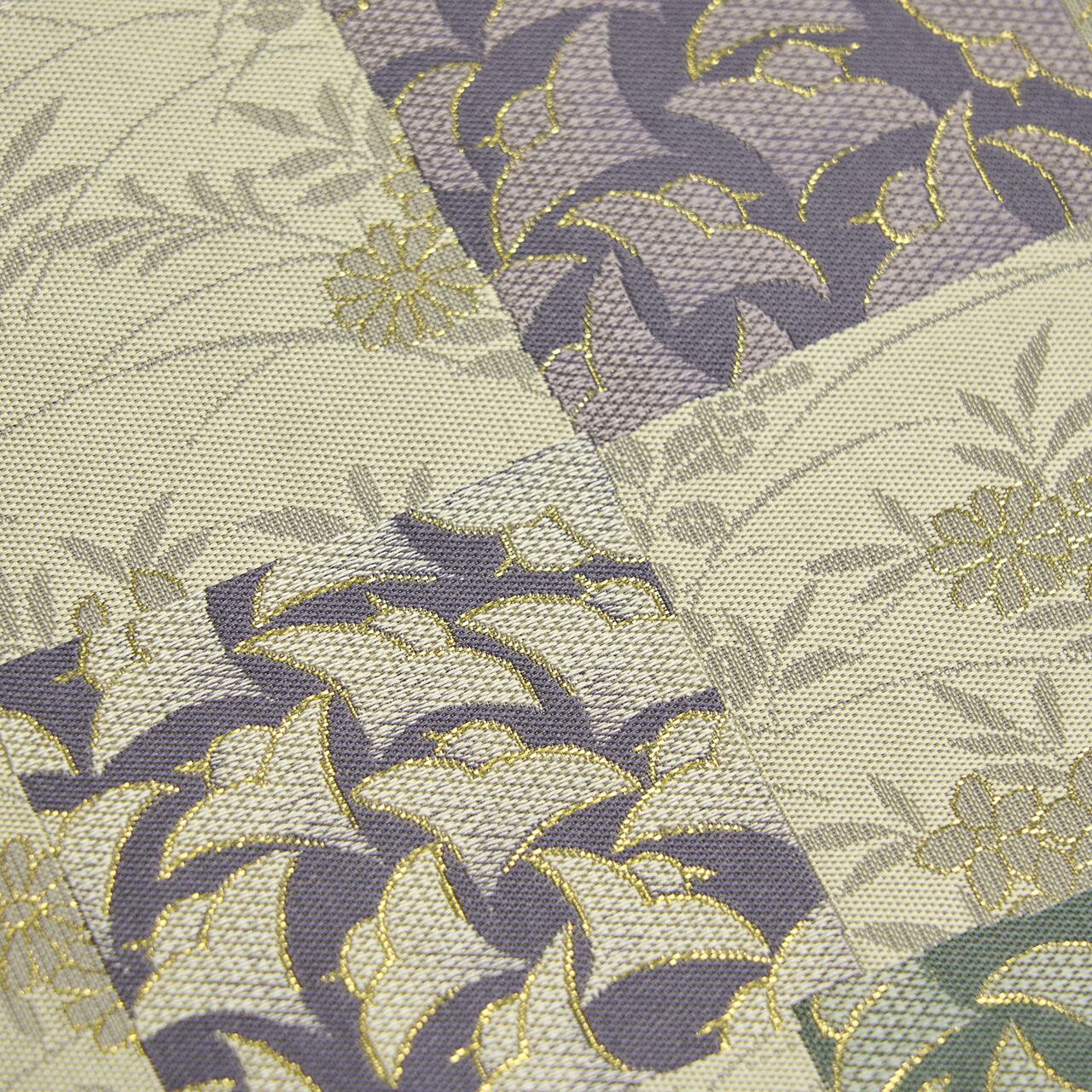 淡い山葵色・絹鼠色の地に、約6cm角の四角が均一でなく置かれた市松模様が取られ、その中に萩や菊、桔梗、ススキ、南天などの草花が紋織され、青鈍色や藤煤竹色、藍墨茶色などの糸で織られた四角には小さな千鳥の群れが織り出された、とてもお洒落な雰囲気の博多織の袋帯です。