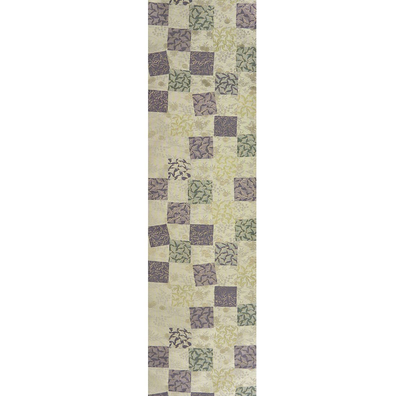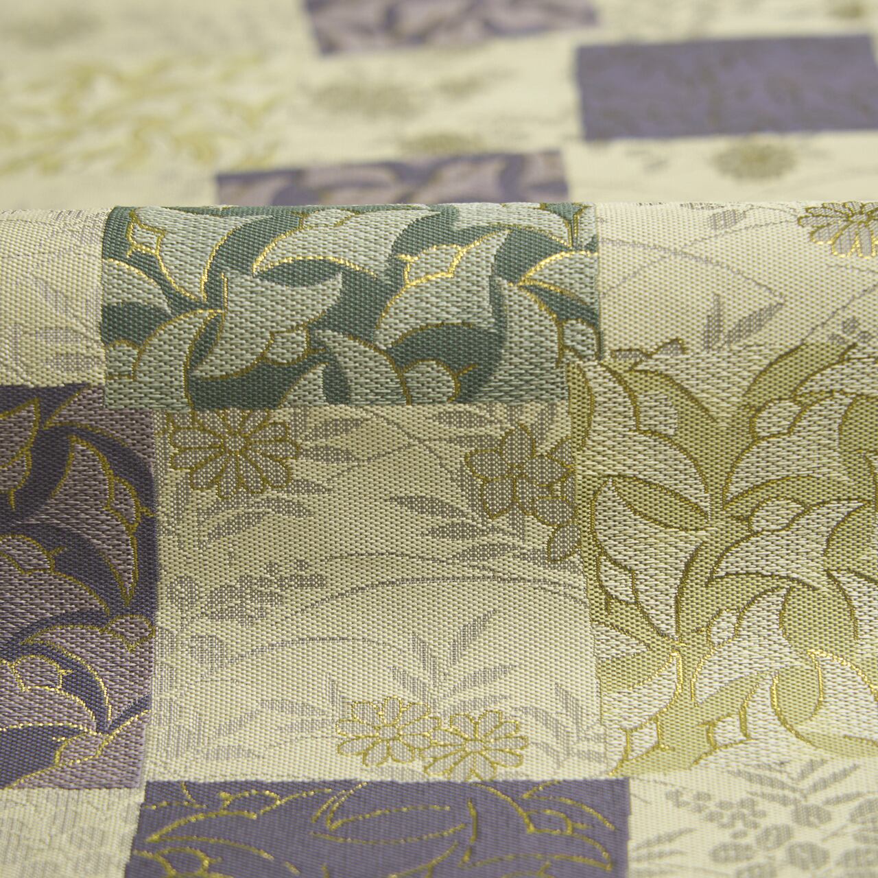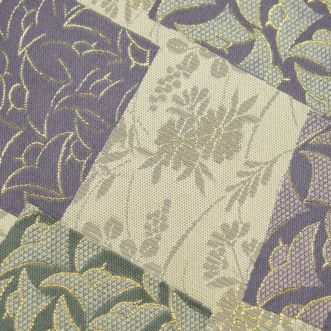 淡い山葵色・絹鼠色の地に、約6cm角の四角が均一でなく置かれた市松模様が取られ、その中に萩や菊、桔梗、ススキ、南天などの草花が紋織され、青鈍色や藤煤竹色、藍墨茶色などの糸で織られた四角には小さな千鳥の群れが織り出された、とてもお洒落な雰囲気の博多織の袋帯です。