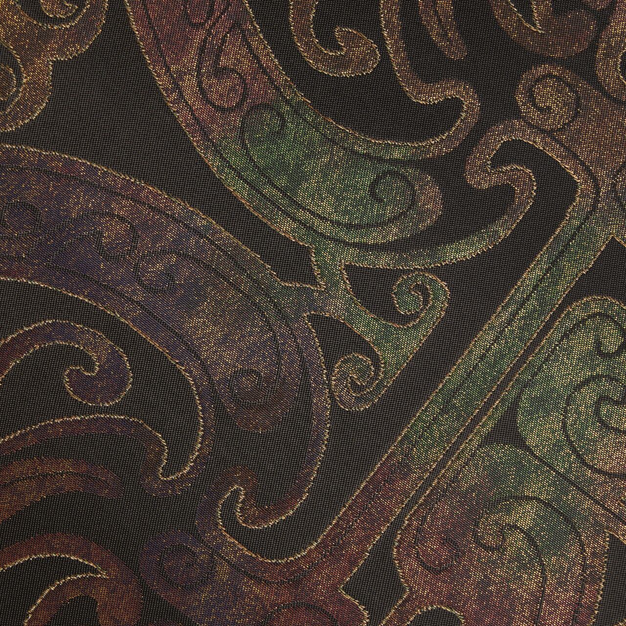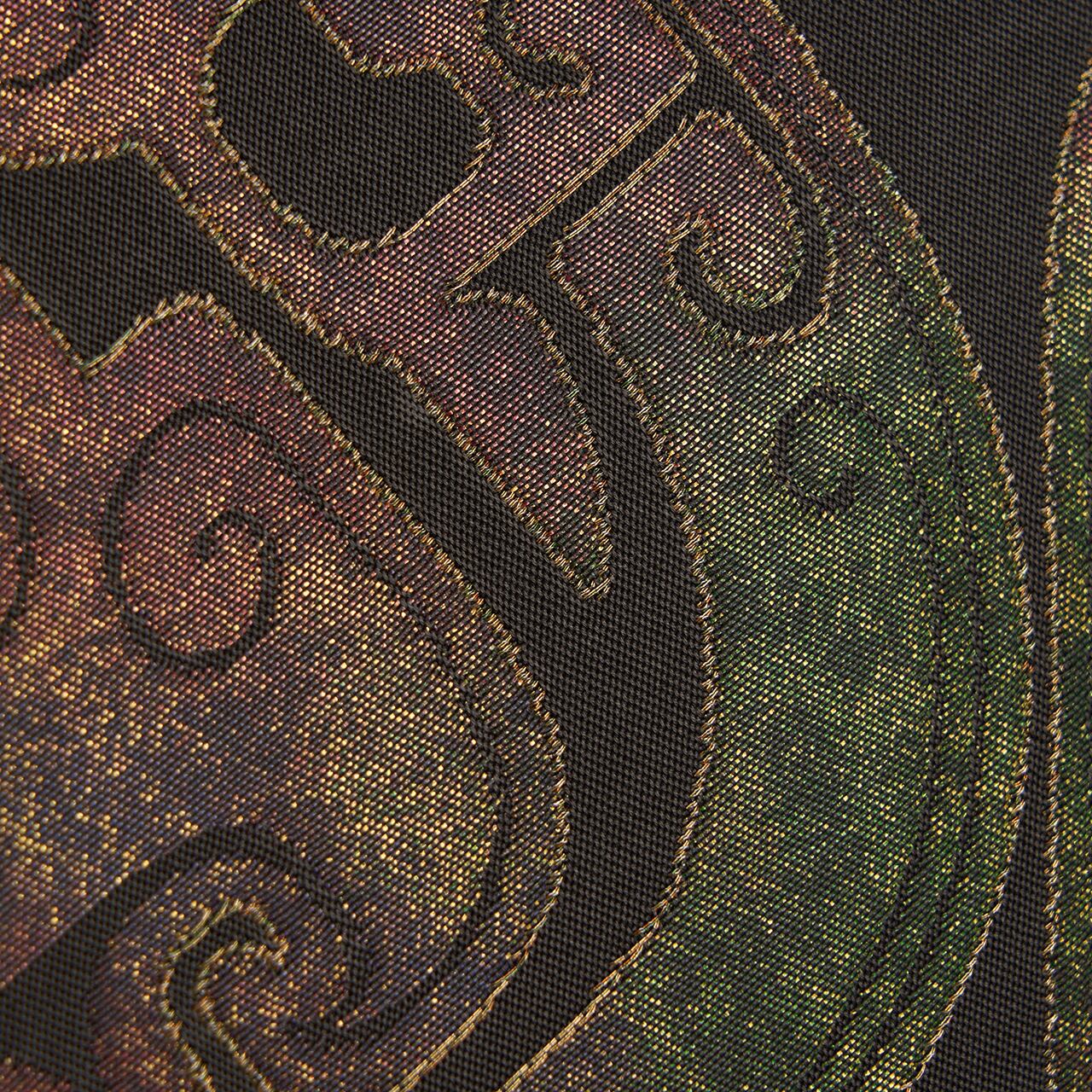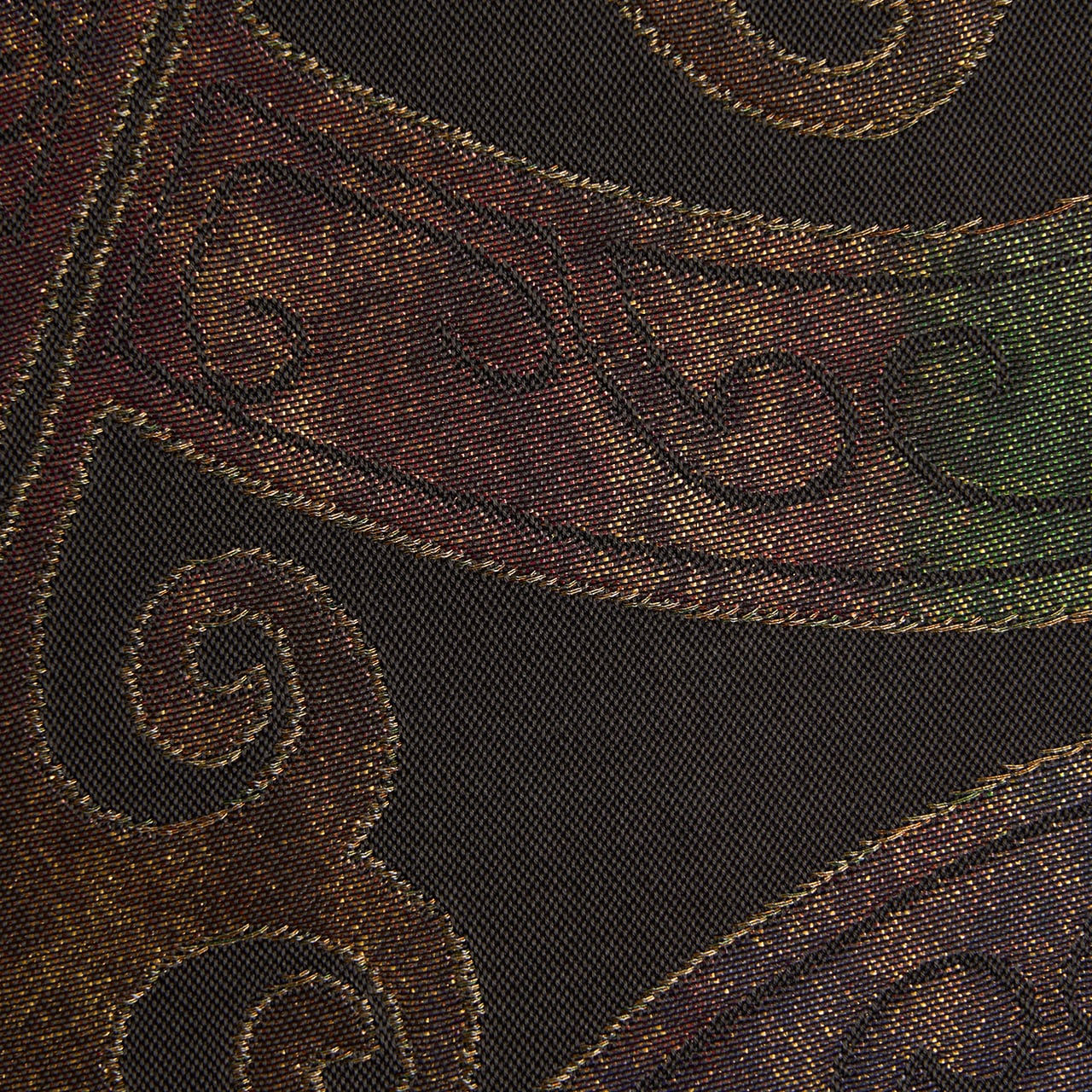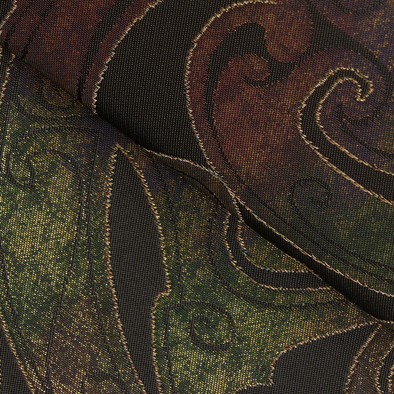 黒のしっとりとしなやかな生地に、非常に細い箔の糸で古代文様が見事に織り出され、その箔の糸の赤褐色の茶系の色や、千歳緑色などが、銅製の置物を見ているかのように独特の光沢で美しく輝いている、素晴らしくお洒落な袋帯です。