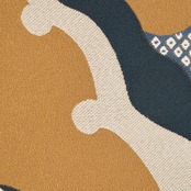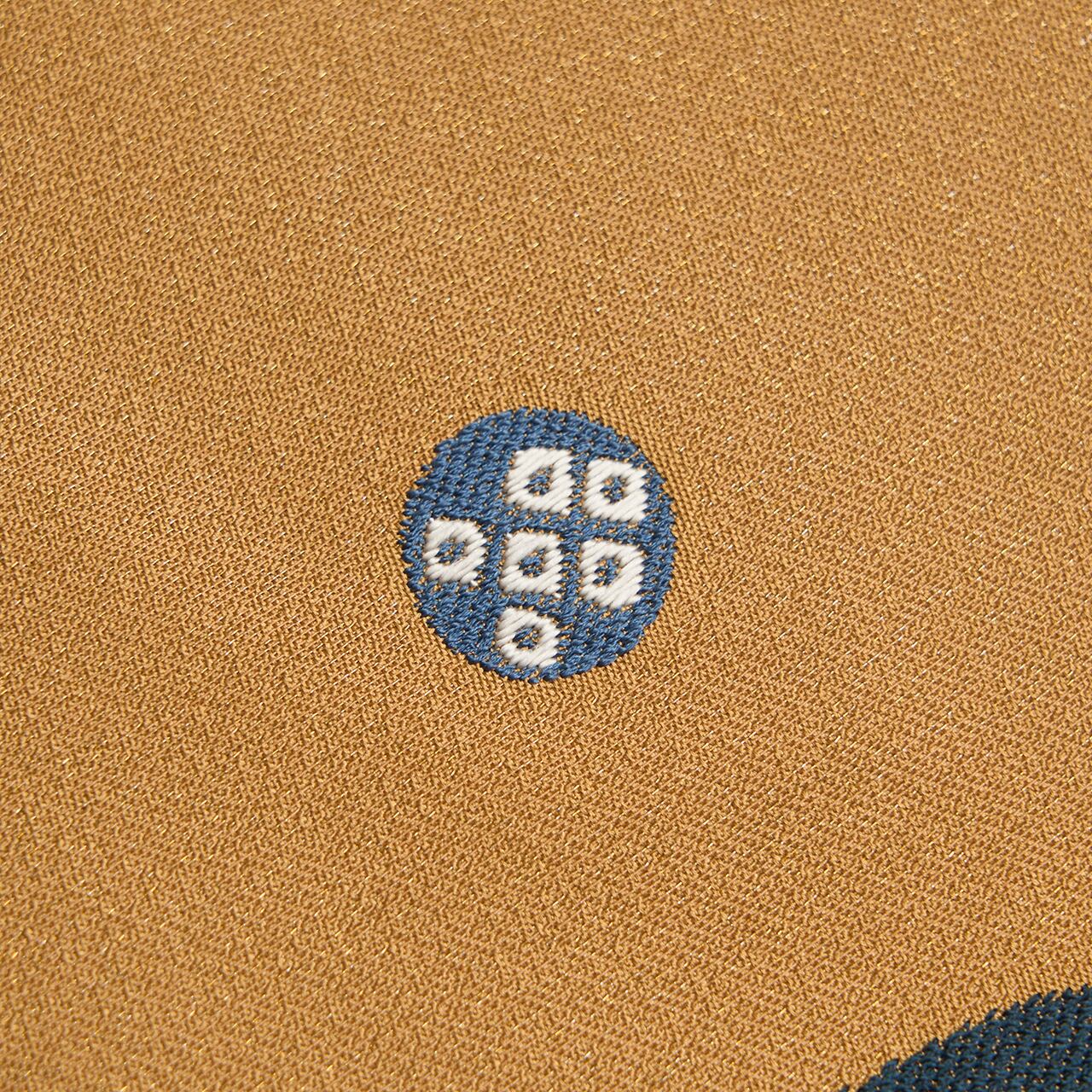 黄色味のある茶・山吹茶色の、極細の糸を使って地金通しにされた生地に、躍動感のある波の模様が、青褐色、鉄御納戸、灰白色などで表され、細かな疋田模様も加えられて、大胆な構図で織り出された、とてもお洒落な雰囲気となっています。