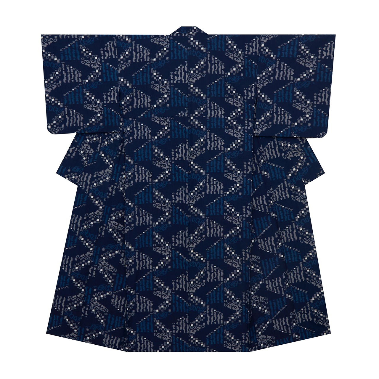 濃い藍色の地に、全体に小さな丸の模様で構成された大きな縦のジグザグの線が取られ、それに沿って生垣のような縦縞の模様が、藍返しの藍色と、グレーの絣糸で織り込まれています。