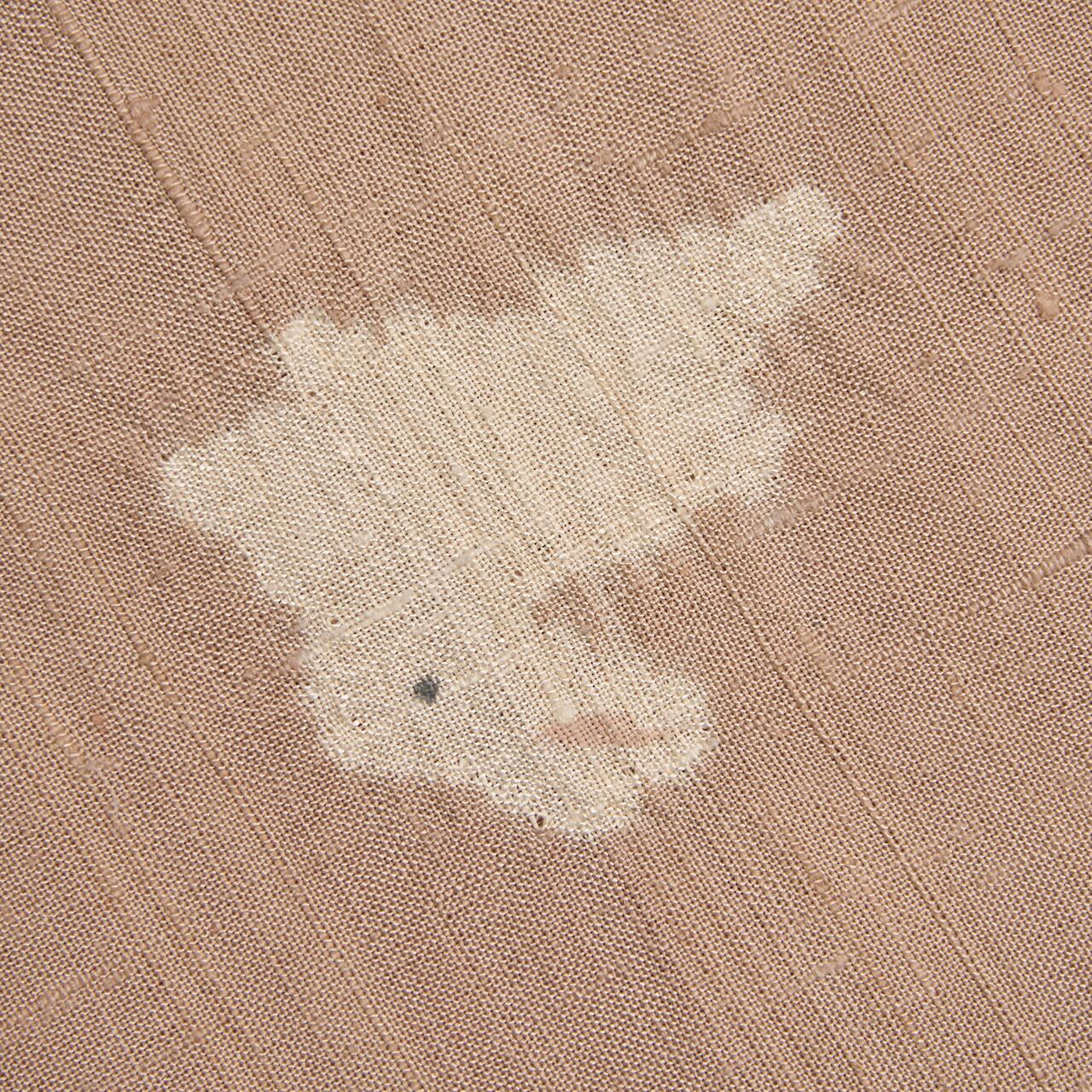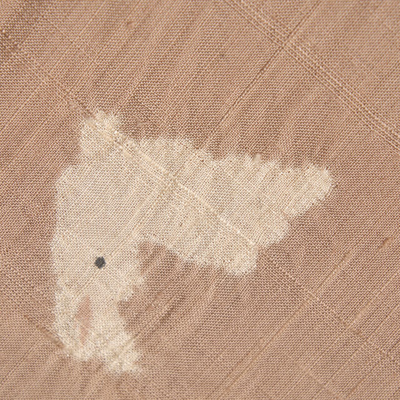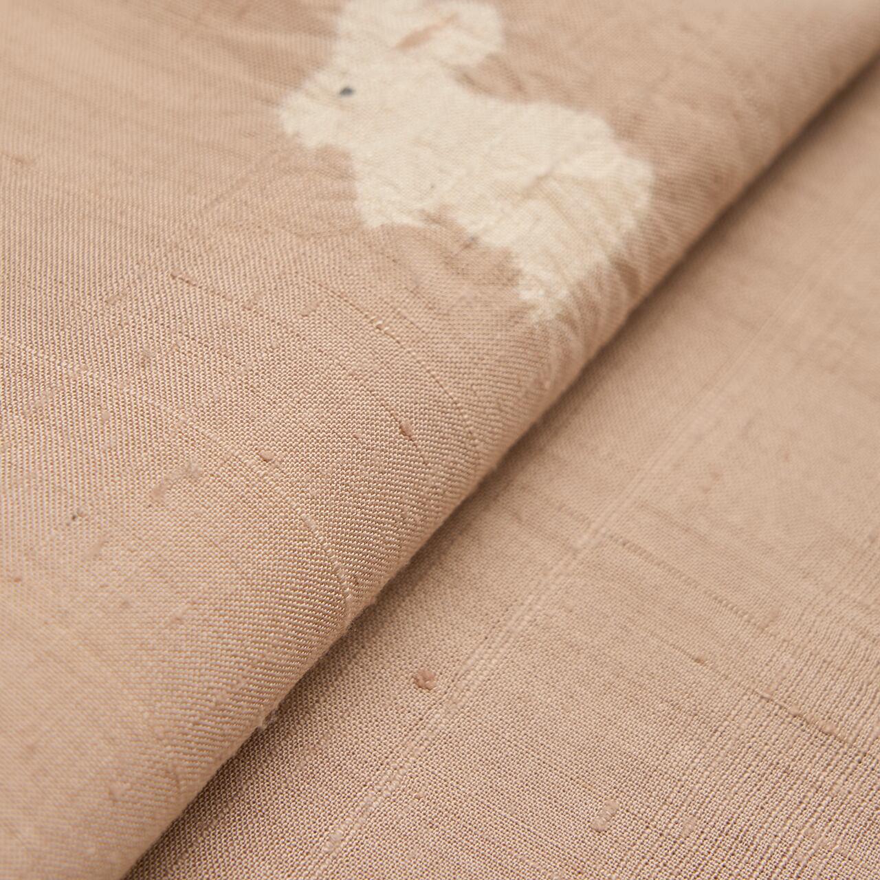 お顔の色が映えるような地の亜麻色がとても優しく、また少し張りのある座繰りの生地に染められた白いうさぎさんが所々に現れてとても可愛く、弾むような楽しさがあります。