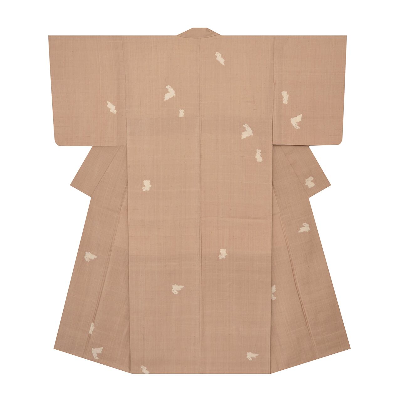 経緯に節のある座繰りの糸で織られた生紬の生地が、少し赤味のある淡いベージュ・亜麻色に染められ、白く小さなうさぎが絞り染めでとびとびに染め抜かれた、とてもチャーミングな印象のしょうざんさんの袷のお着物です。