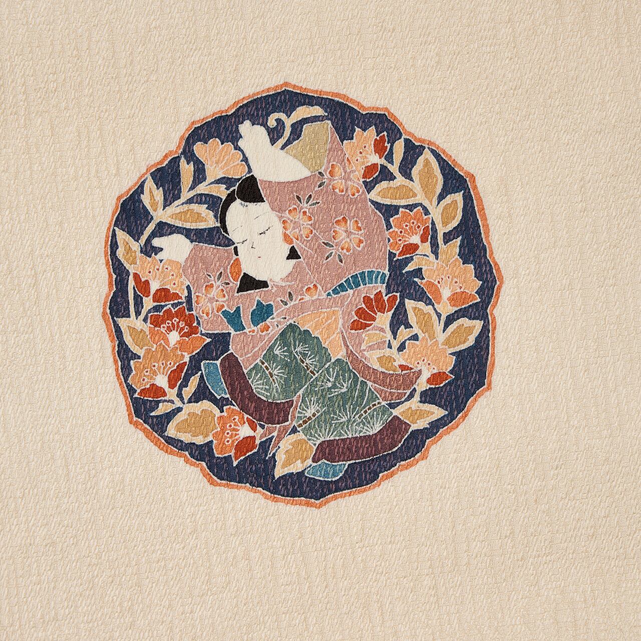 少し光沢のある、変りみじん格子のような地模様の象牙色の生地のお太鼓に、古鏡の形が取られて中が黒に染められ、そこに舞を舞っているようなポーズの童子がいて、お花の輪に囲まれた優雅な模様が手描きの細やかな友禅で描かれた、素敵な九寸名古屋帯です。