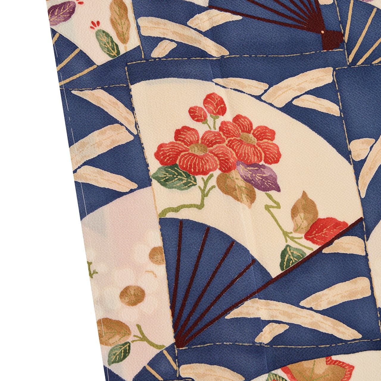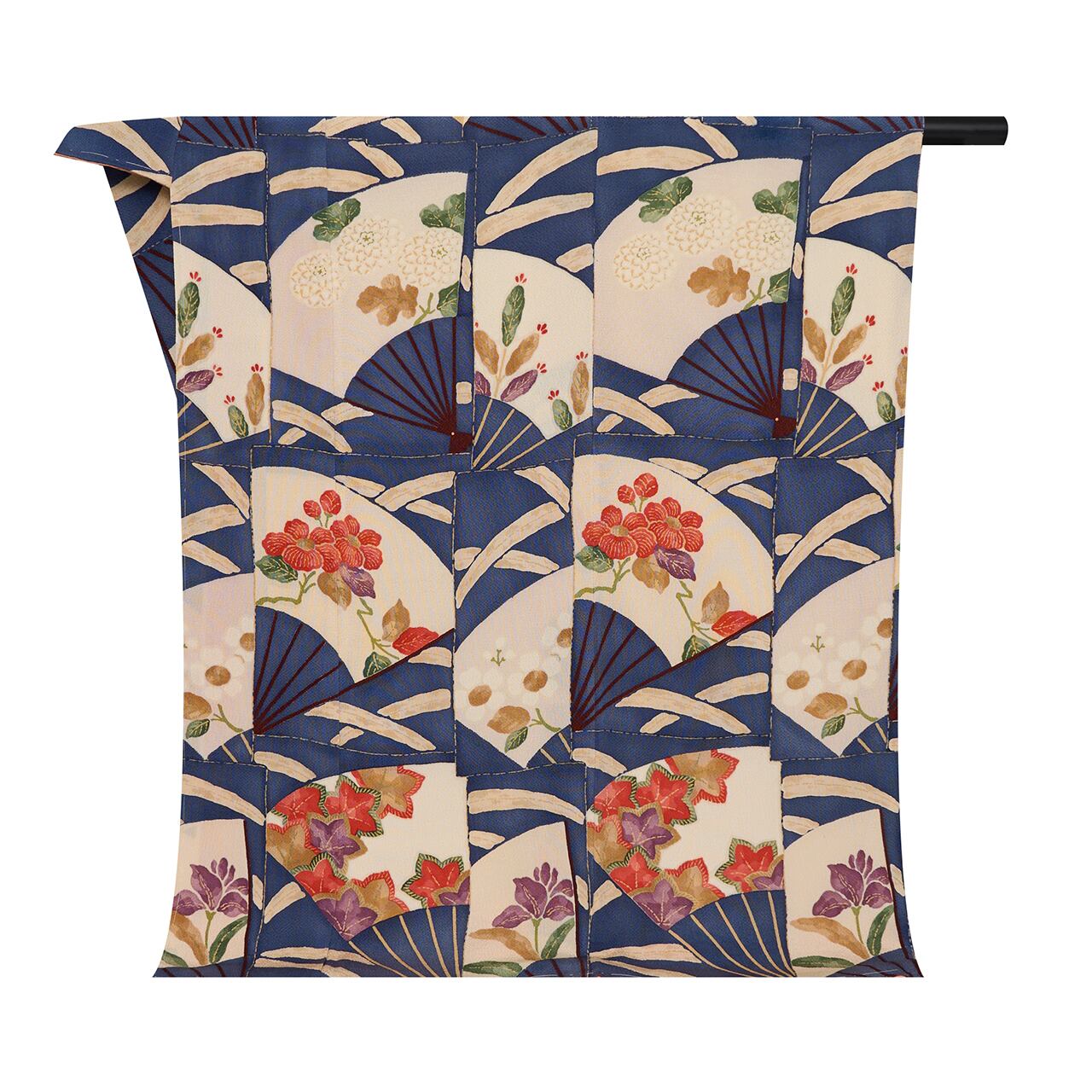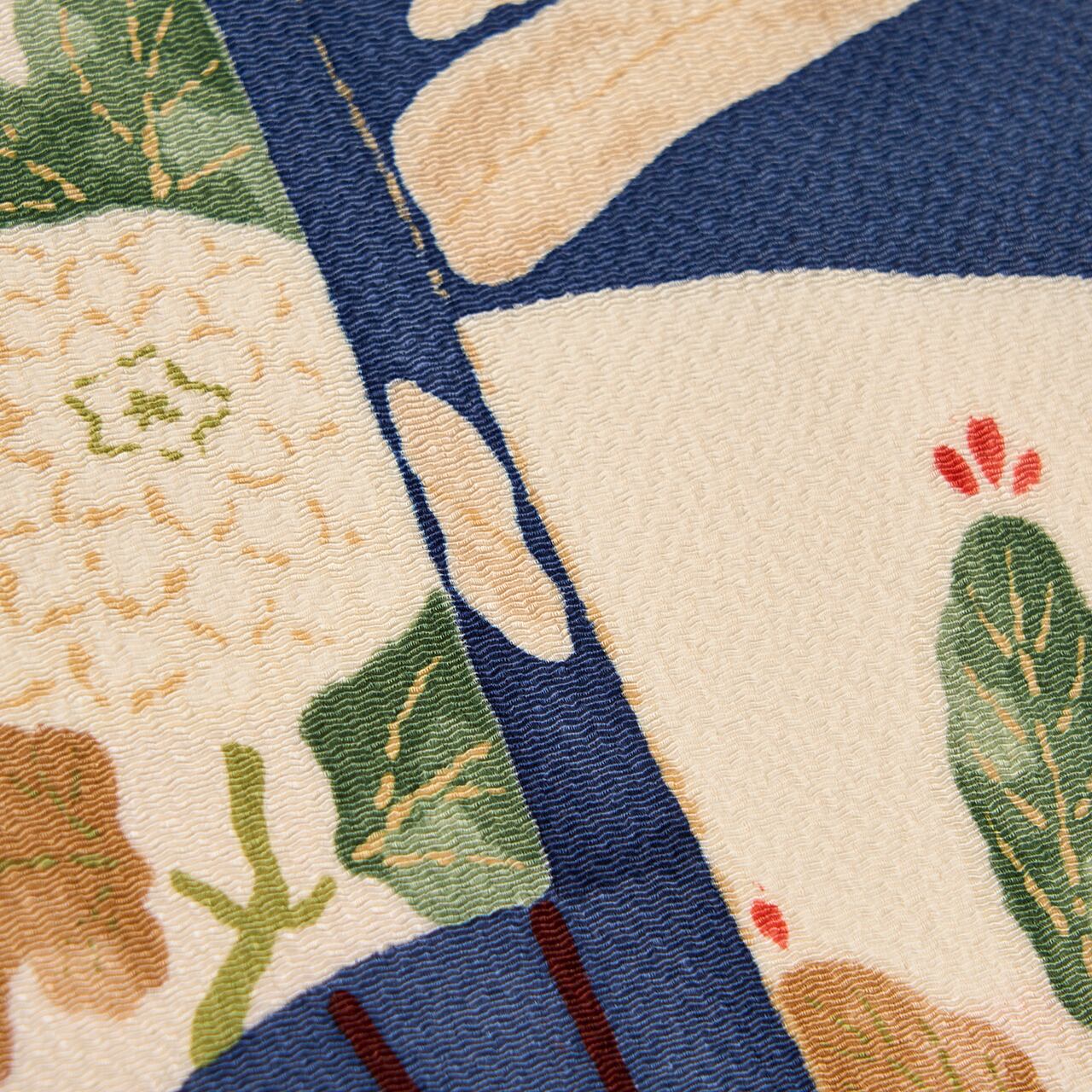 少しシボのあるぽってりとした重めのちりめんの生地が、グレー味のある藍・青褐色に染められ、大きめの扇の形が象牙色で染め抜かれ、その中に菖蒲、紅葉、菊、梅、松、椿などのお花や草木が描かれた、古典の良さのある華やかな印象の小紋の袷のお着物です。
