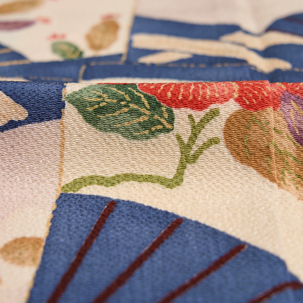 扇面の傍らには芝の葉も描かれていて風情が感じられ、木や草花も直接描かれるのではなく、扇の中の絵のような演出になっているのも、どこか文芸模様的でお洒落です。