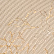 とても細かい斜め格子の網目のような地模様のある象牙色の帯地に、全体には段の形に金糸と銀糸で花唐草の模様が織り出され、お太鼓にはもくもくとした雲のような形が金糸で取られた中に、鉛丹色の淡いオレンジと、新橋色の明るい水色、そして金色の箔の糸でお花の模様が織り出された、少し可愛らしい雰囲気もある本袋帯です。