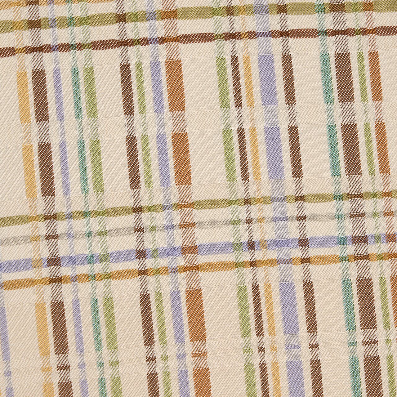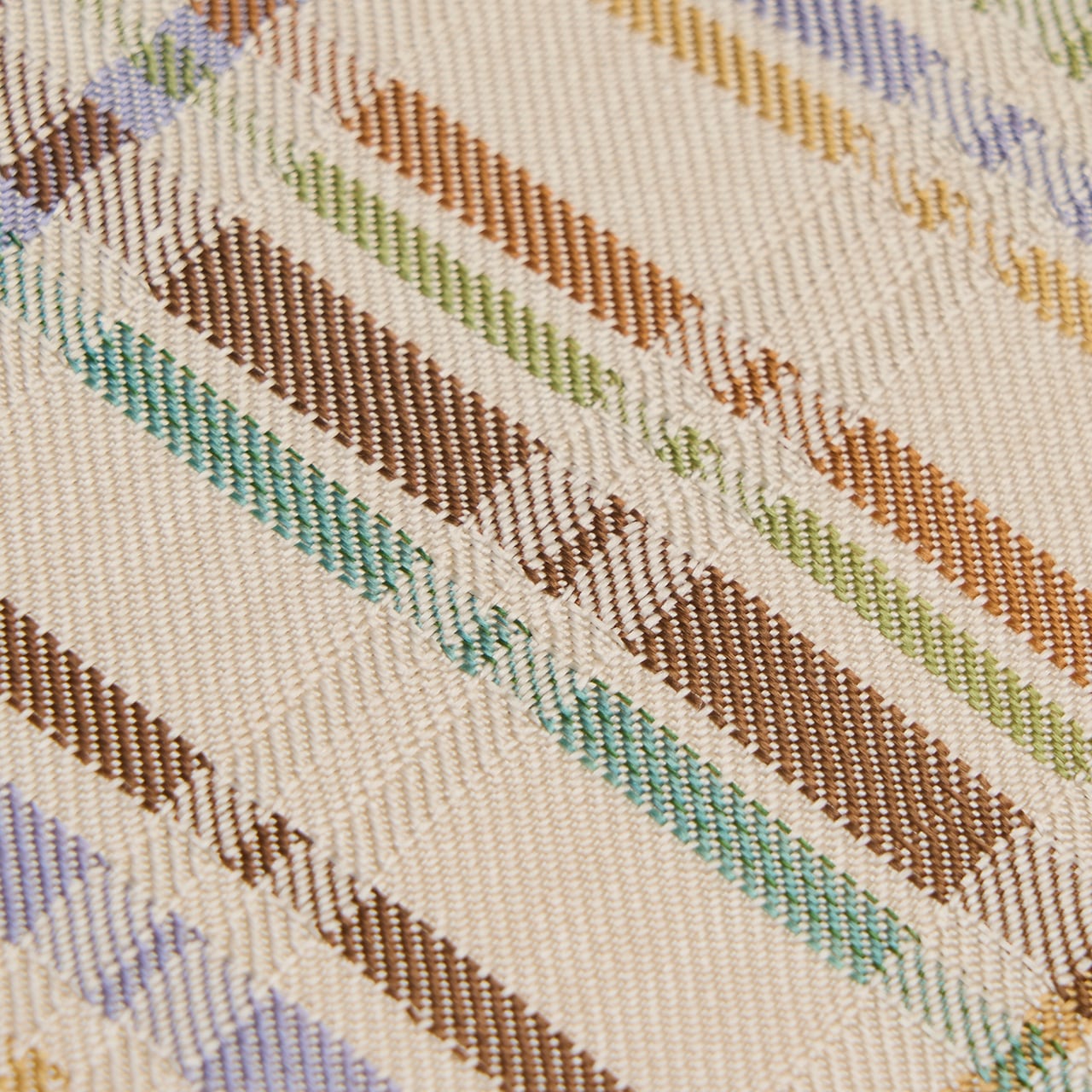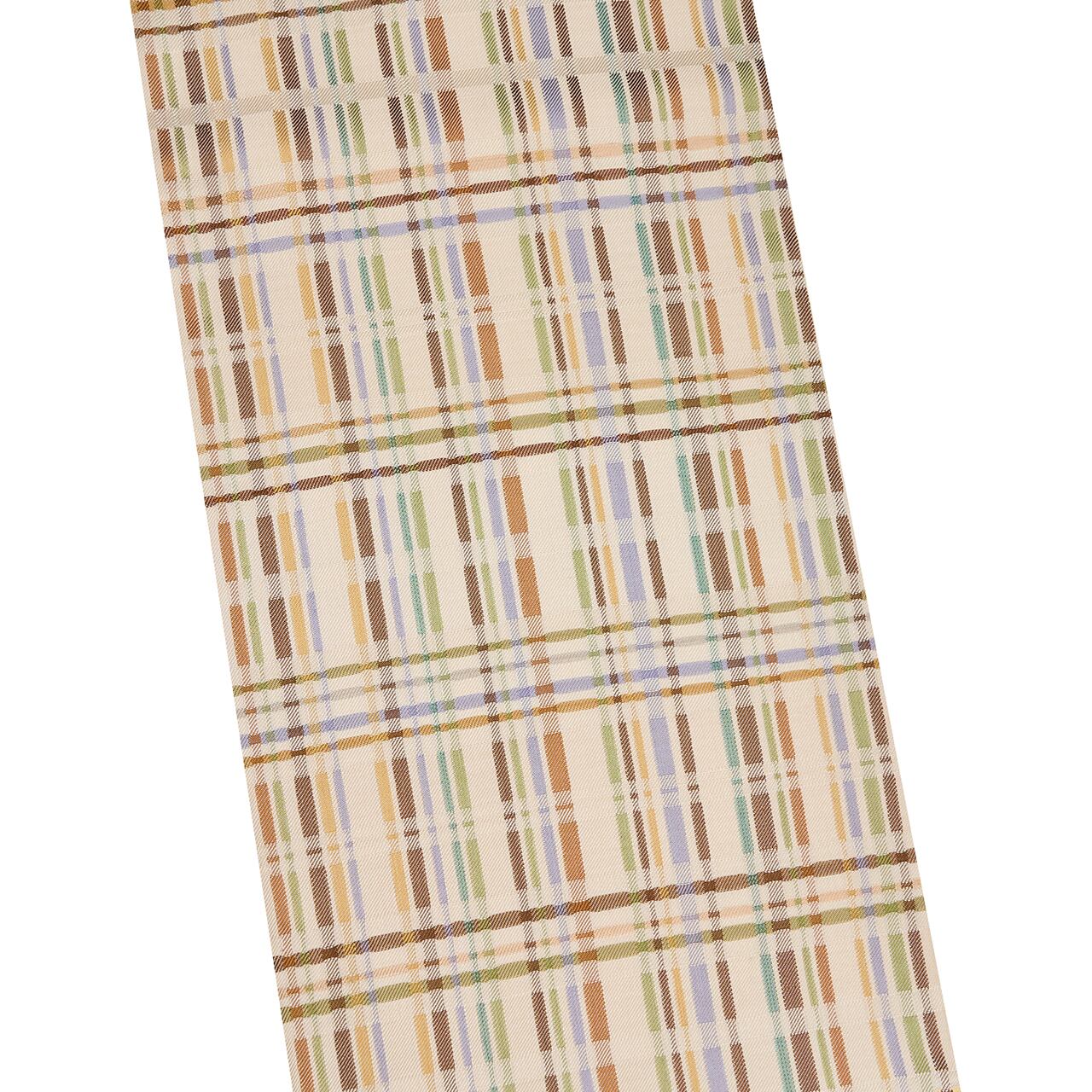 象牙色の綾織の地に、縦には草木染ならではのやさしい色調の、涅色の焦げ茶、桑色の黄色、薄鼠色の淡い紫、焦香色の金茶、老竹色の草色といった調子に、たくさんの色が並んで素敵なハーモニーを奏でているように心地よく、横にはランダムに交差する細い縞が2本だったり、4本だったり、太い縞が1本だったりといった具合に織られ、お洒落な模様を構成した、素晴らしい九寸名古屋帯の作品です。