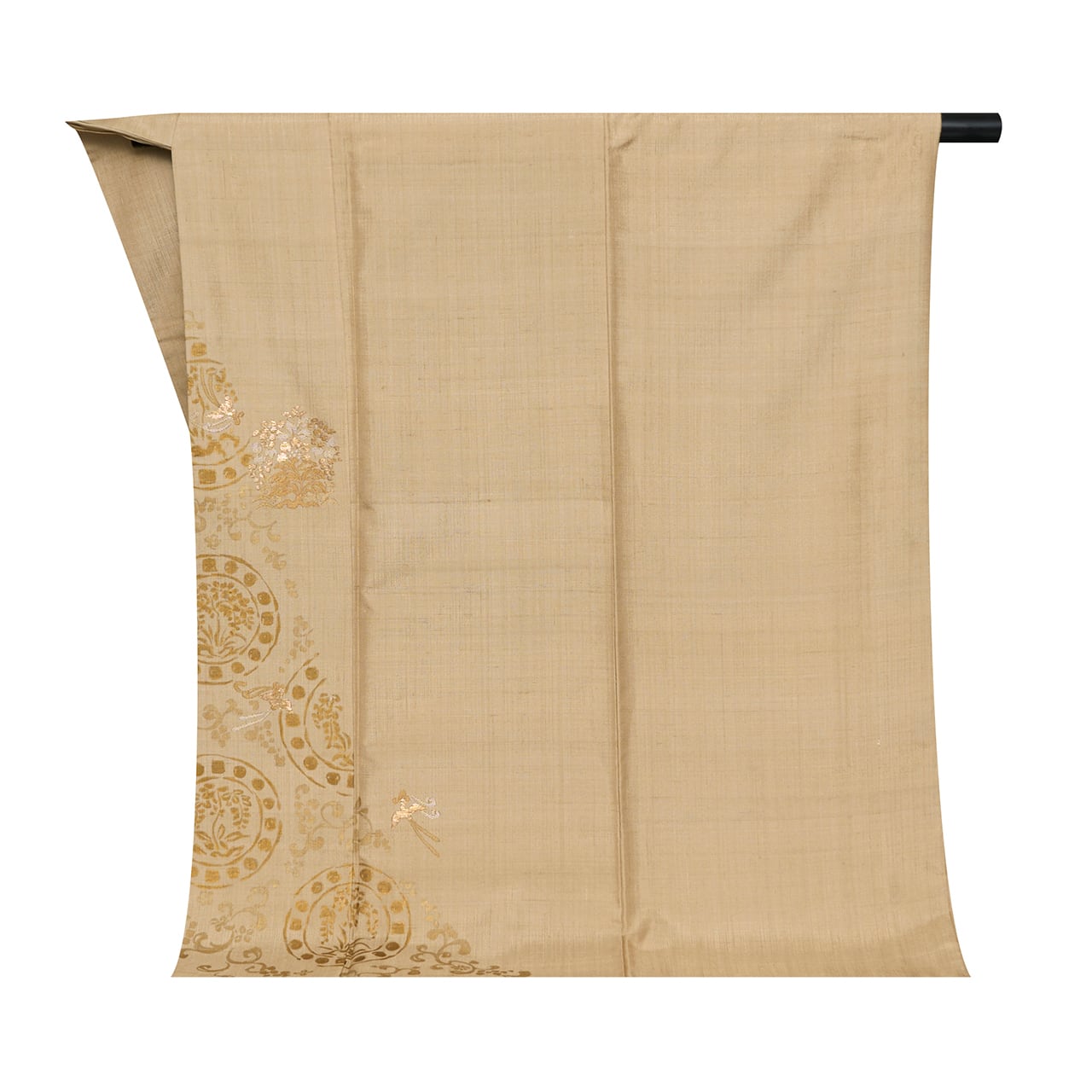 こちらは上前の衽と前身頃、左の袖口に、燻し金のような少し抑えた色合いの金で丸の形が取られ、その中に枝垂れるように咲くお花と、丸の模様をつなぐように蔓草の模様が描かれています。