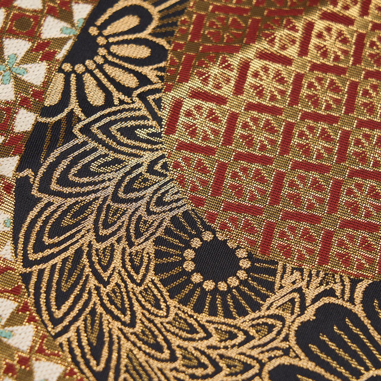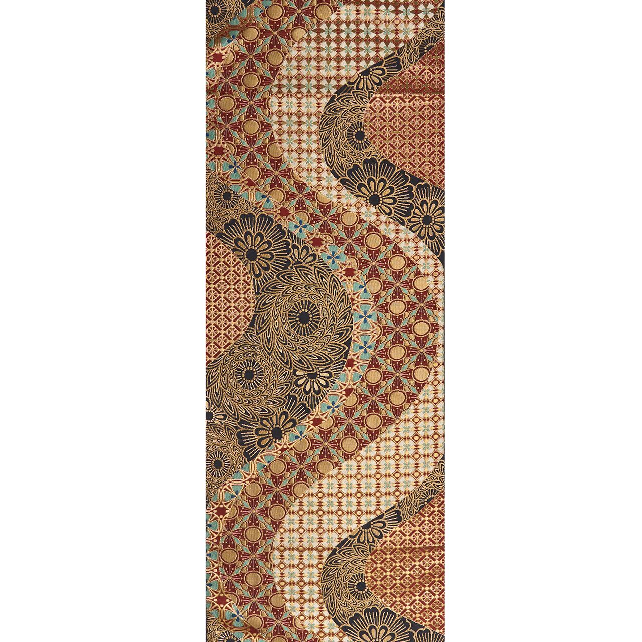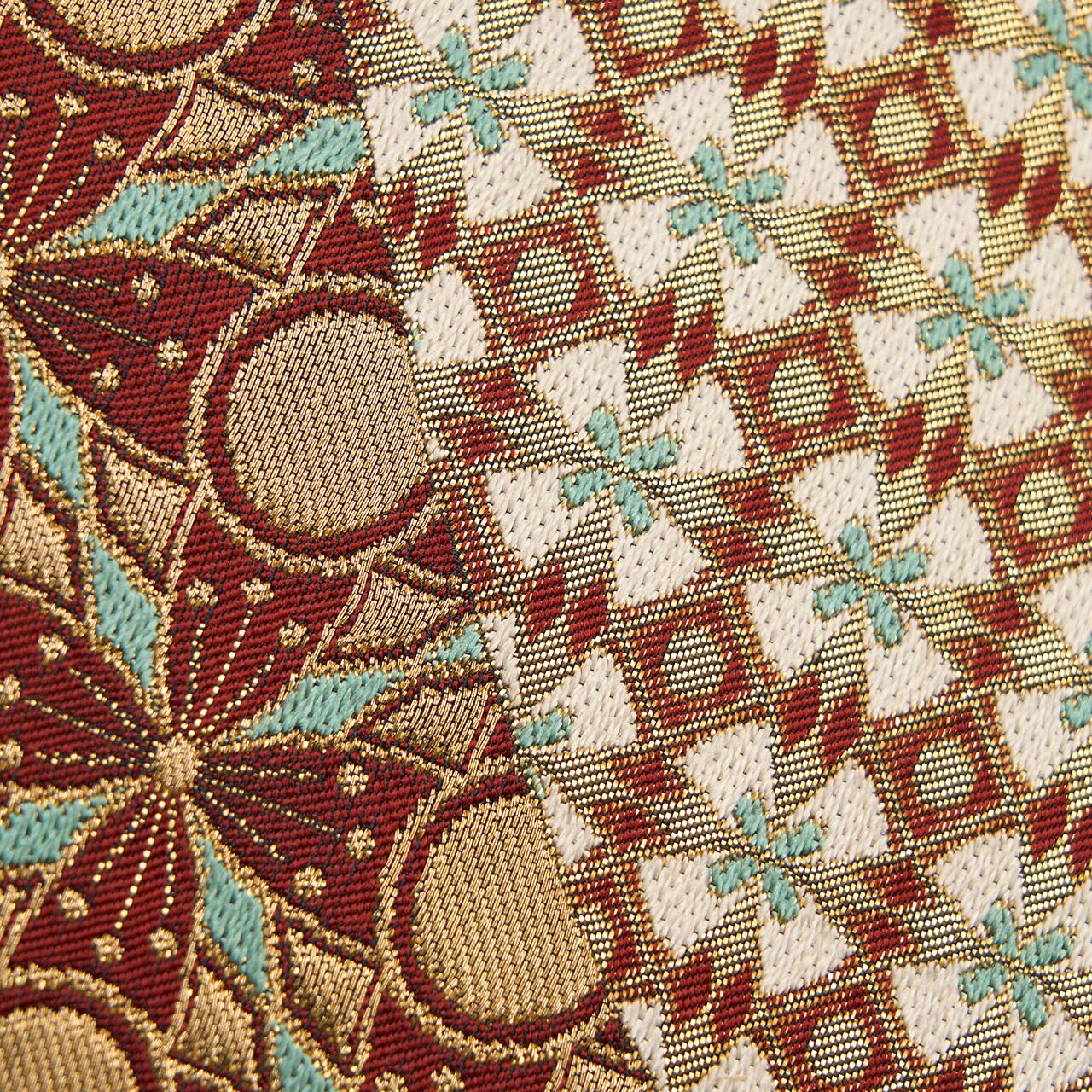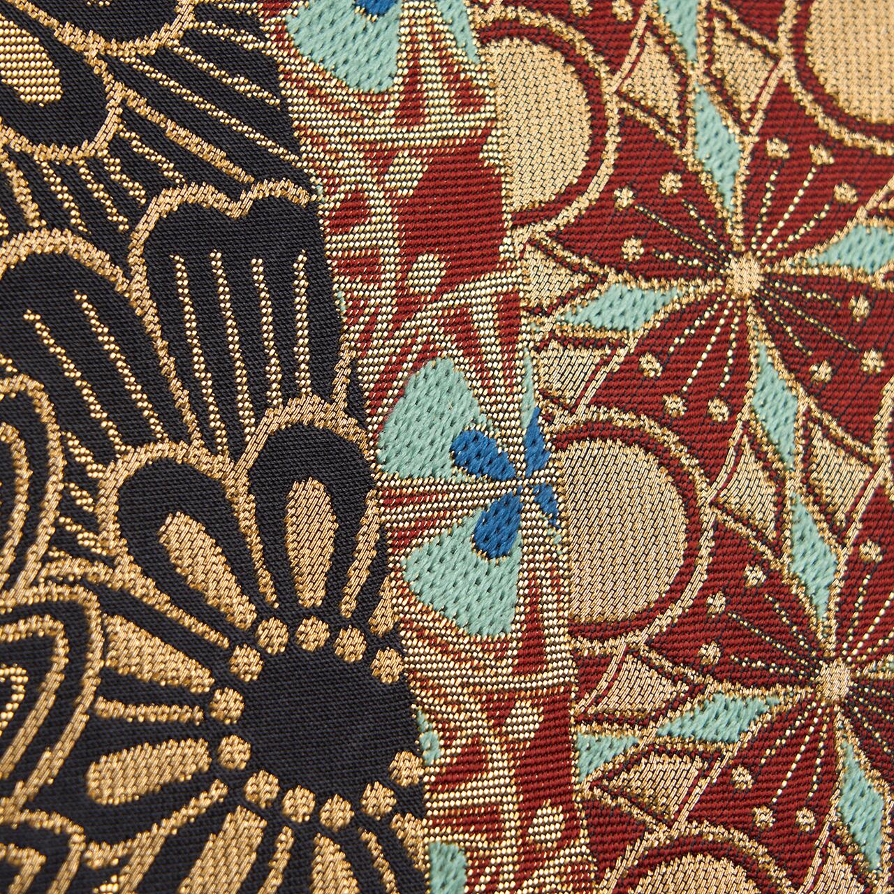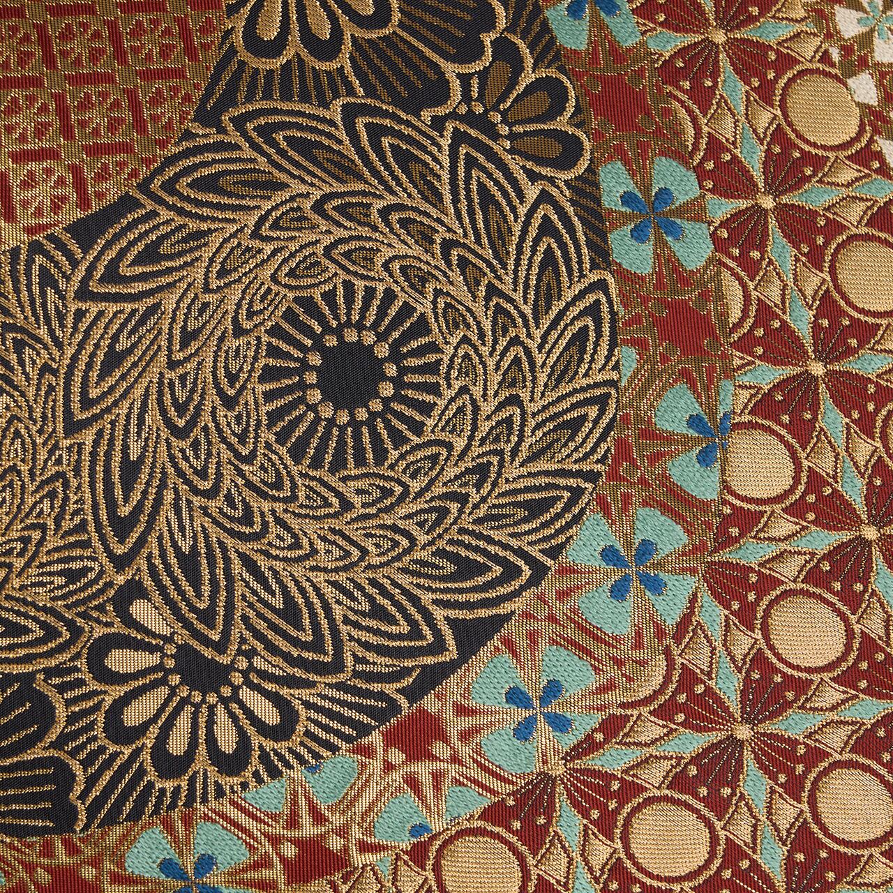 川島織物さんの作品の中では、少し珍しいデザインといえるような力強さが感じられ、デザインと色使いからはどことなくオリエンタルな雰囲気が感じられる、素晴らしい帯となっています。