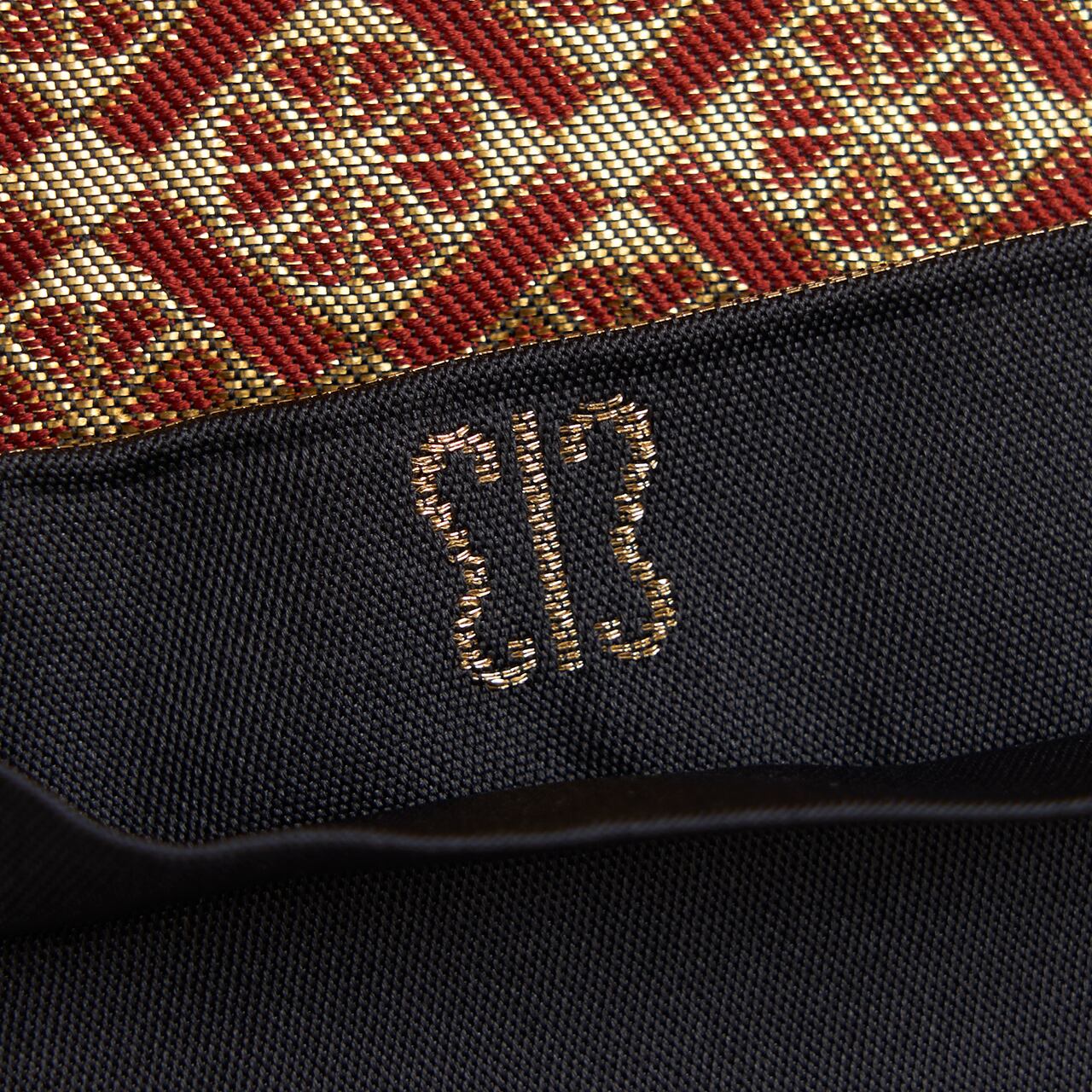 模様のボリュームがあるためあまり見えませんが、地は黒で、それに丸と剣のような形をした菱の模様の縞が流れのあるジグザグの線で一気に描かれ、その左側には黒地に金糸で菊のお花が織り出された縞が流れに乗っているかのように寄り添って描かれ、右側には白い4枚の花びらのお花がびっしりと並んだ模様の縞が描かれています。