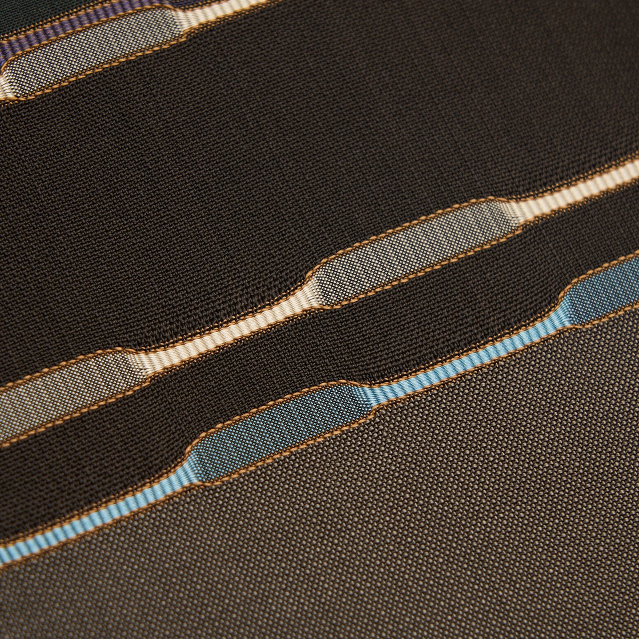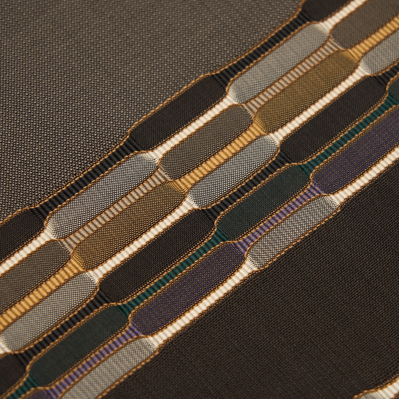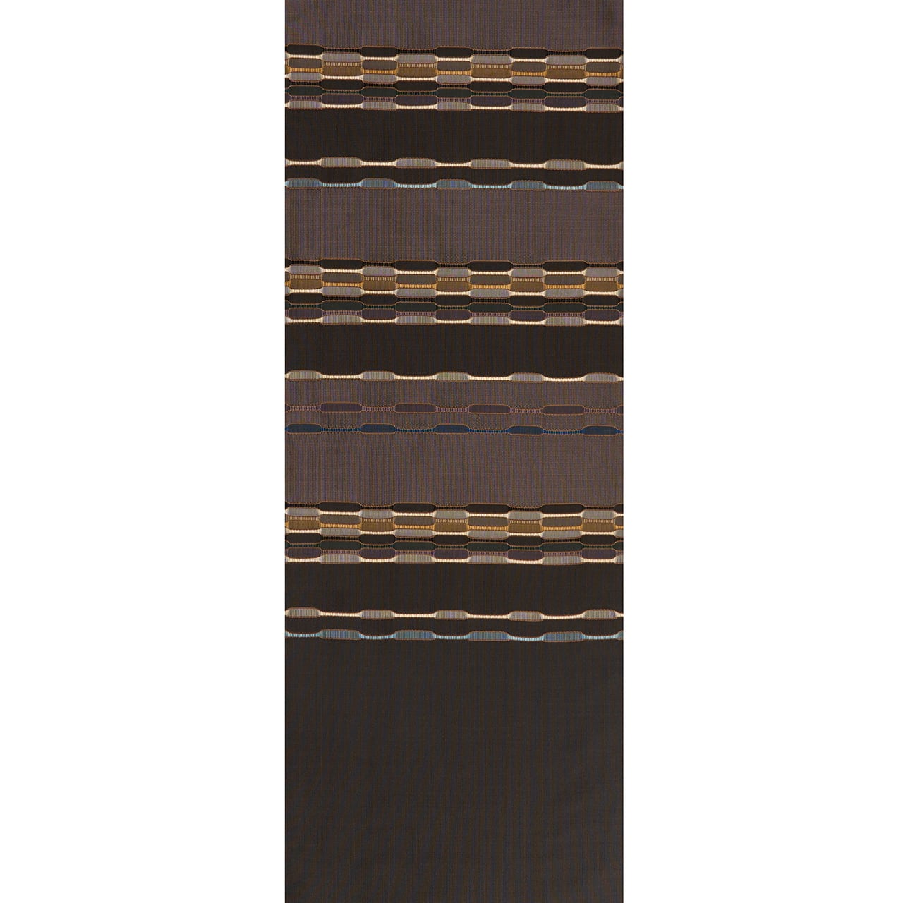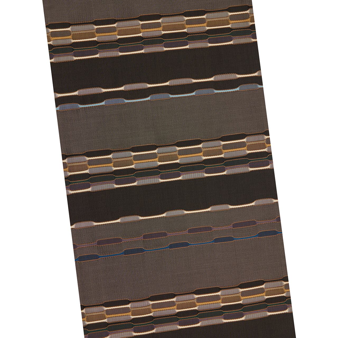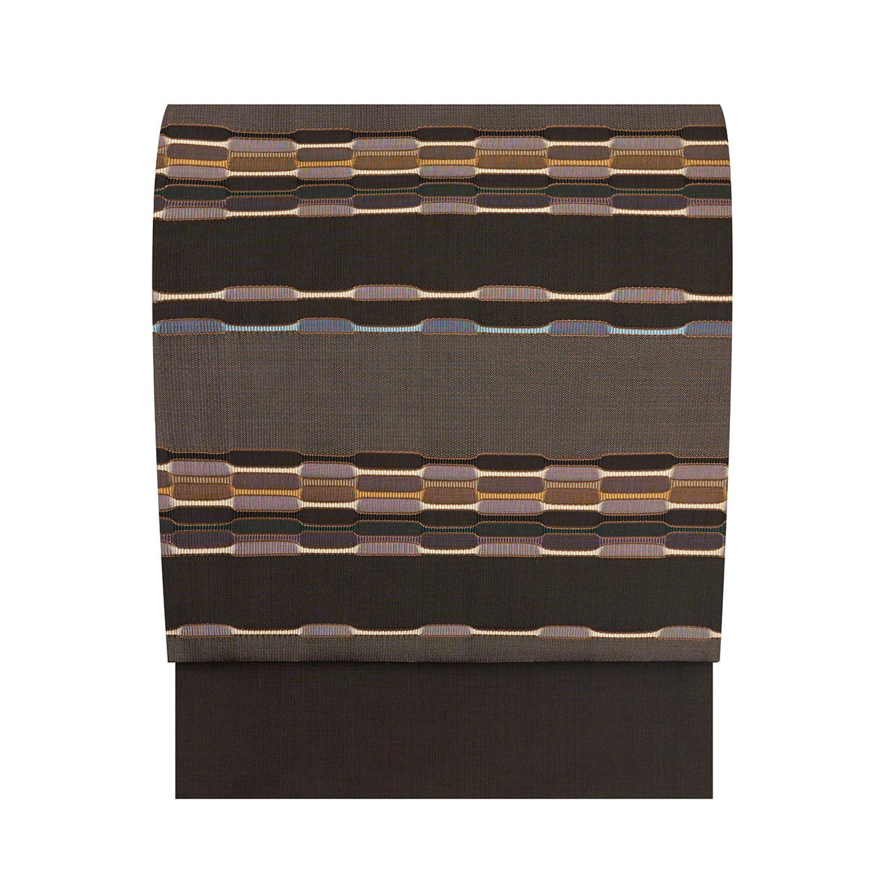 地色は黒に近いですが、草木染のため真っ黒ではなく、少しだけ赤味のあるとても深い焦げ茶・赤墨色で、お太鼓には中間のとてもクリアな印象のグレー・煤色が置かれ、それを背景にして、たくさんの色の糸を使って段変わりに模様が織り出された、とてもお洒落な帯です。