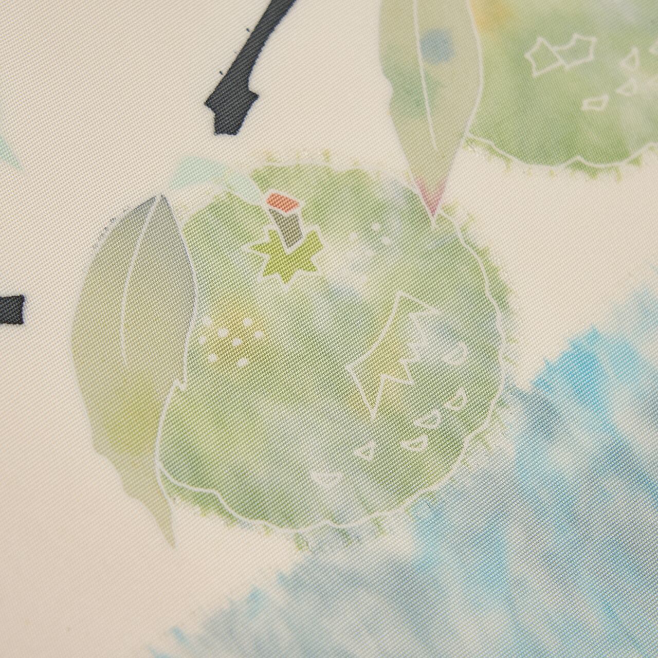 絶妙な色使いにも木原さんのセンスが感じられ、気品のある雰囲気となっていて、淡色で表されたゆずとは対照的に、比較的はっきりとした色で表された枝の藤鼠色や伽羅色、藍墨茶色などが綺麗なアクセントとなって、模様全体を活き活きと見せているようです。