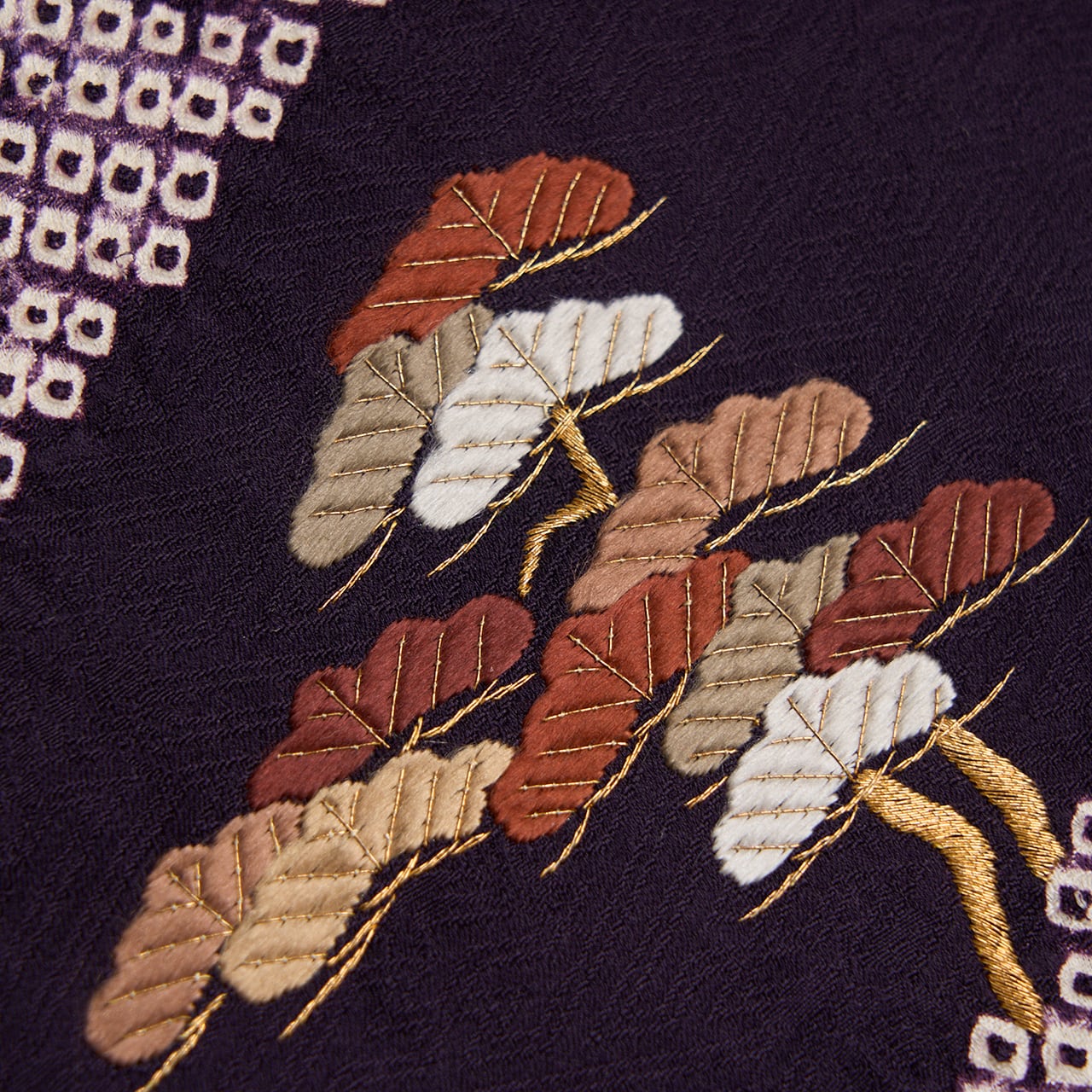 小ぶりの紗綾型に菊と春蘭の地模様が織り出された、濃い紫・紫黒色の綸子の生地のお太鼓に、斜めの線で細かな疋田の絞り染めが施され、その間に松の木や紅葉、菊のお花などがとても細やかな手刺繍で表された、少し格高な印象にもなった二部式の九寸名古屋帯です。