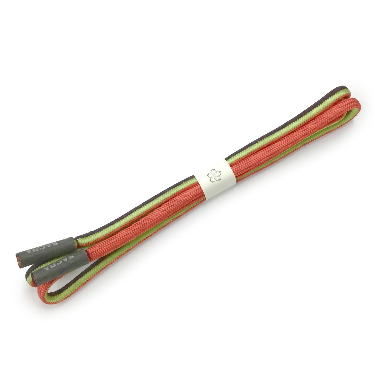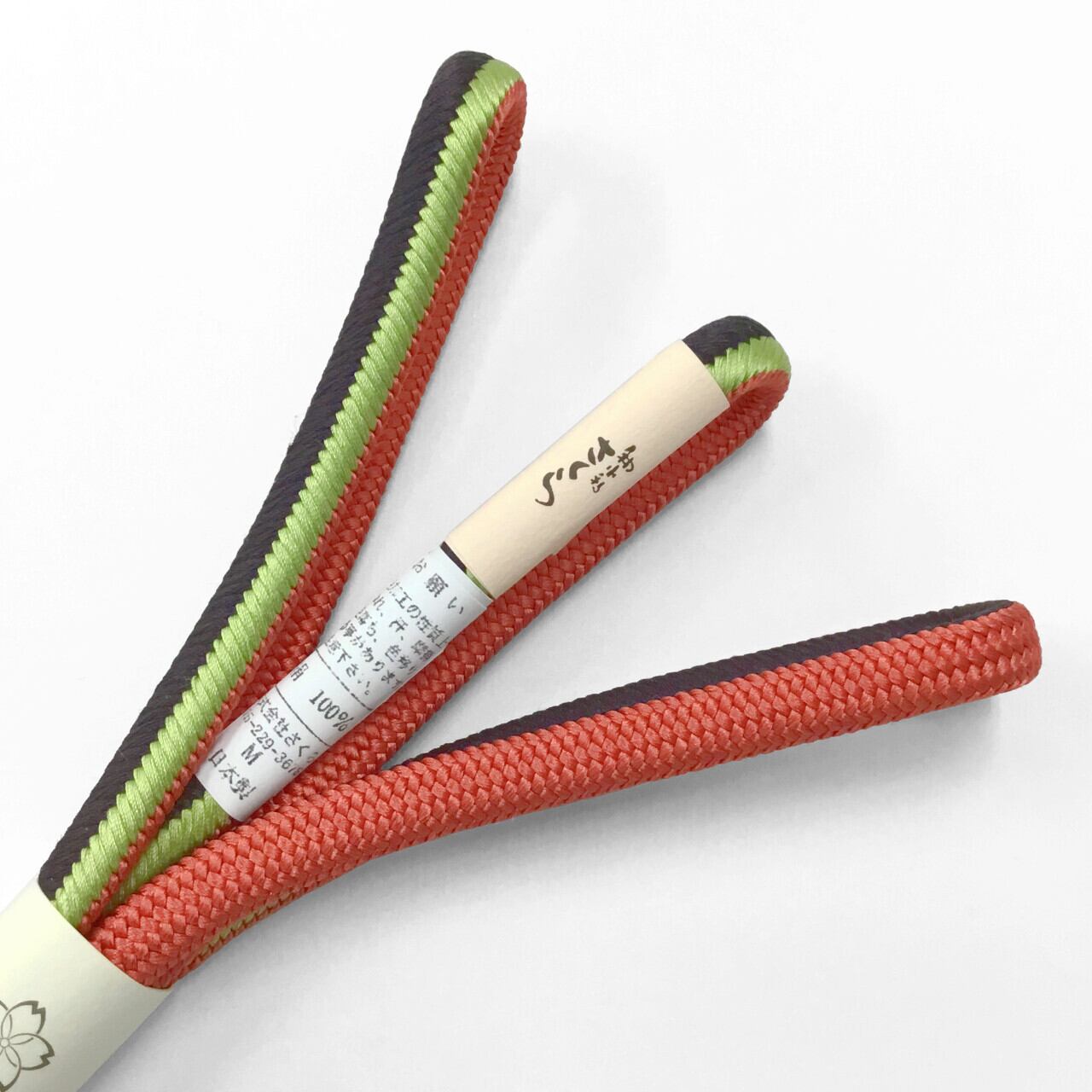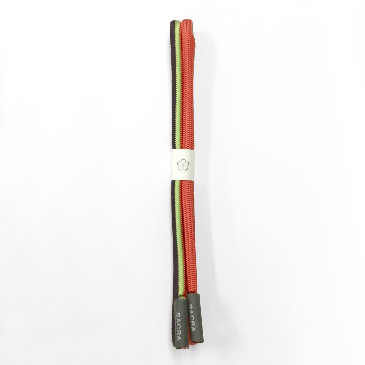 和小物さくら 帯締め 丸唐大和 鉛丹色に苗色と赤墨色 絹100%【新品】