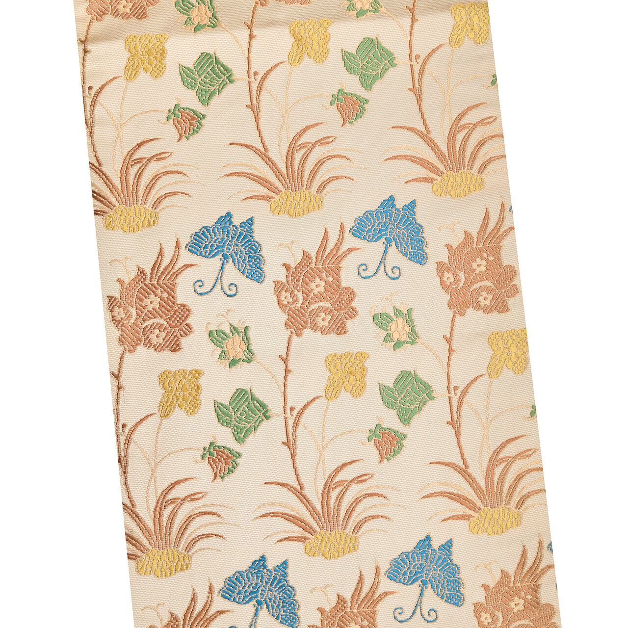 淡いクリーム・練色の横に非常に細かい縞が織り出された生地に、胡桃色や松葉色、芥子色などの糸で、中型の大きさの唐花と、そこを紺鼠の蝶々が飛び交う様子が唐織で織り表された、華やかな中にも格調高さが感じられるような、川島織物さんの素敵な九寸の開名古屋帯です。