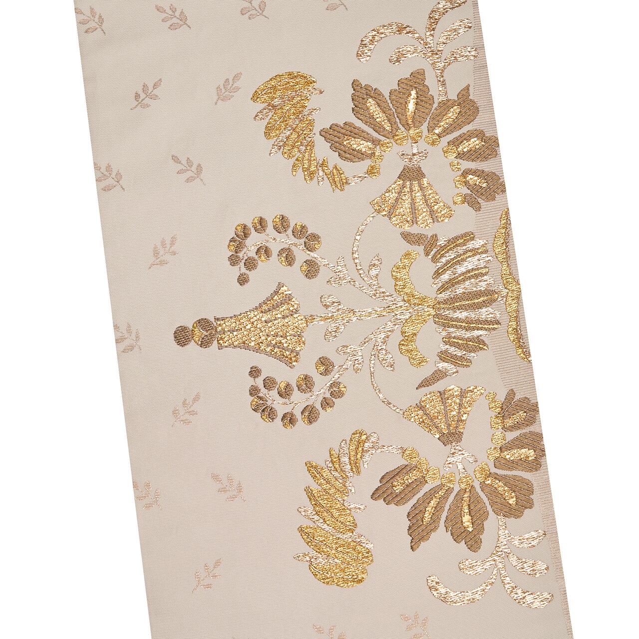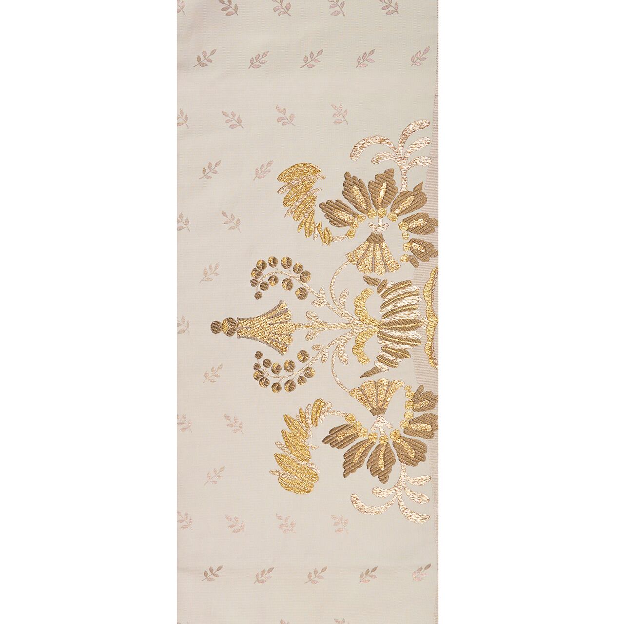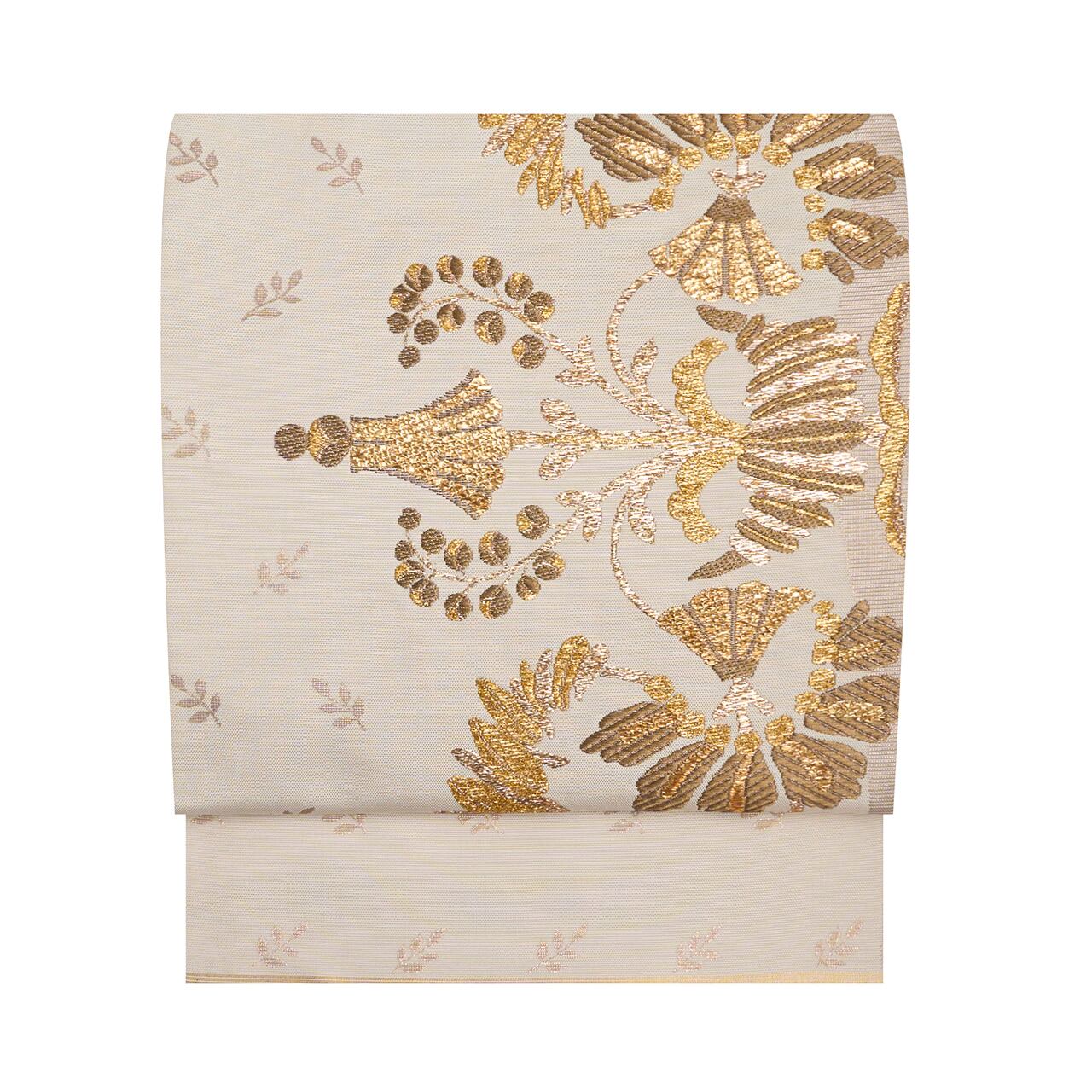 横に極細の縞のような地模様のある柔らかい質感の象牙色の生地に、右端にはとても淡いグレーベージュ・枯野色の箔の糸で立涌のような、よろけ縞のような縁取りがされ、お太鼓にはやや太めの金の箔の糸を駆使して大胆な模様が織り出されていますが、その凹凸感が素晴らしく、お太鼓の形にされると大変ゴージャスでボリューム感が現れる、素敵な本袋帯です。