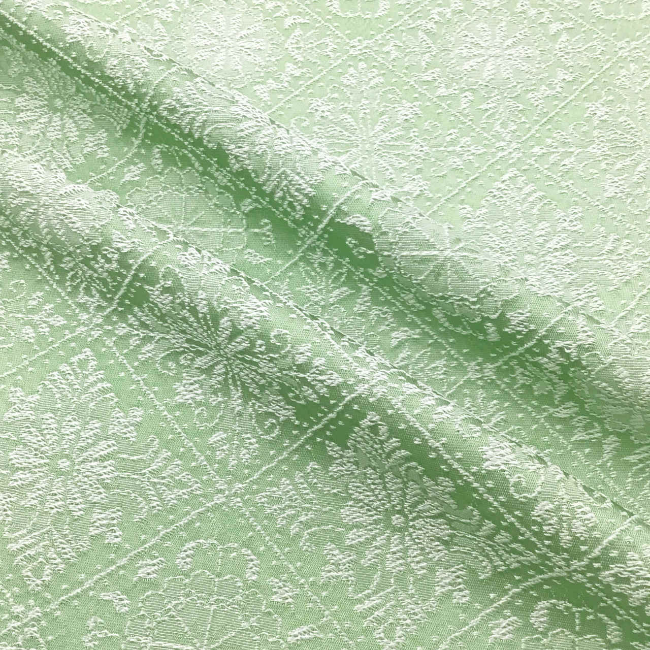 柳色の丹後ちりめん地に防染糸で約 8 cmの白色の華紋が菱形格子に織り込まれています。