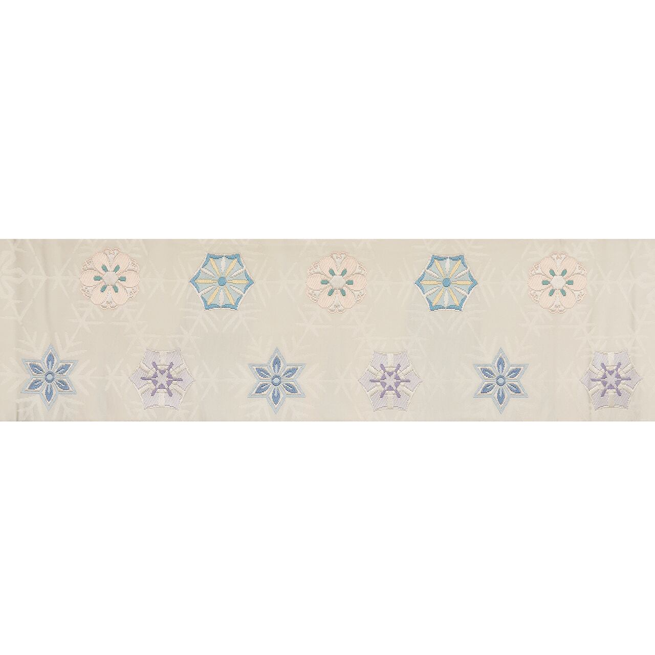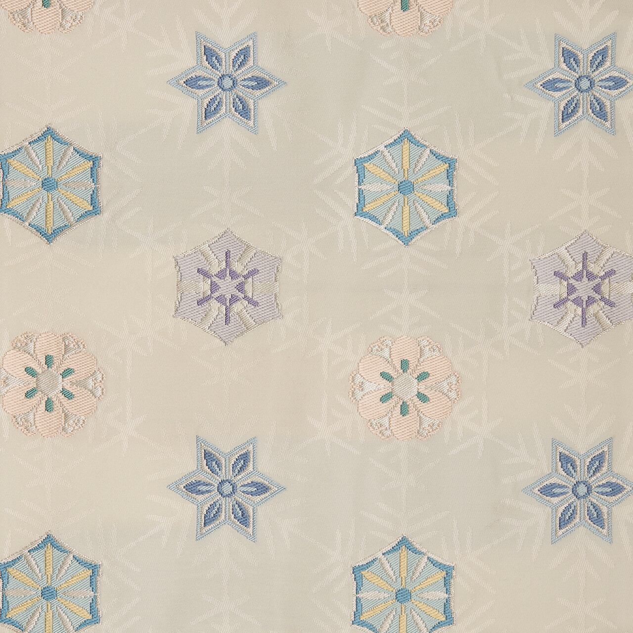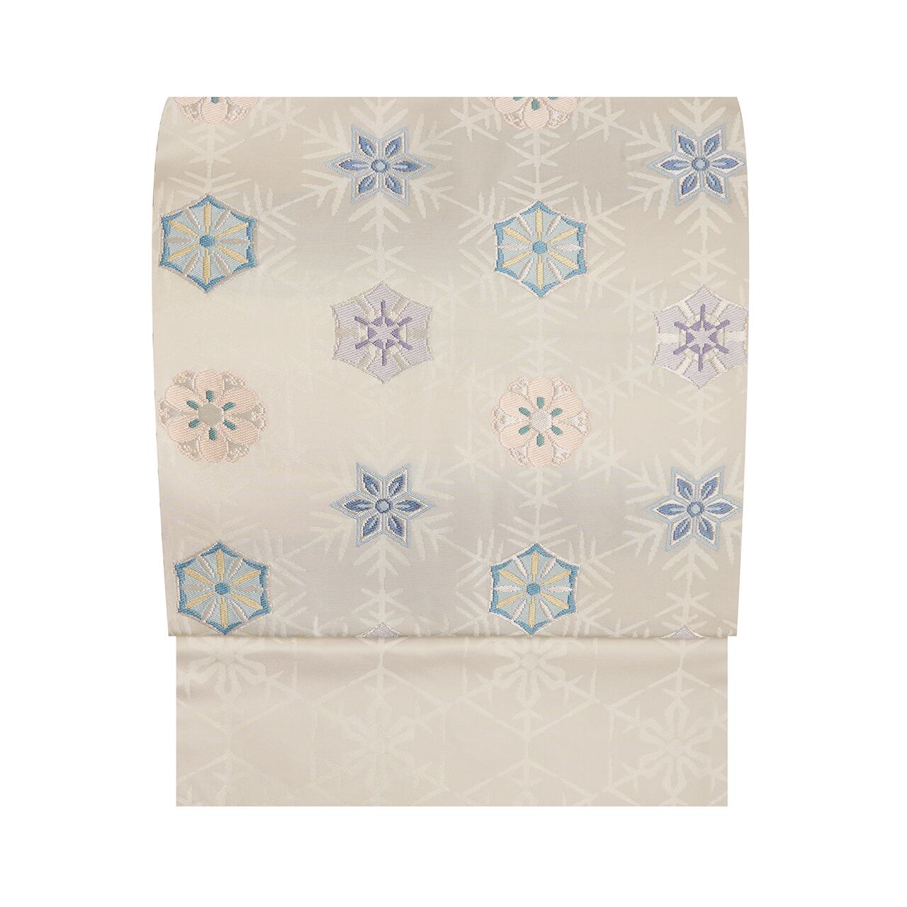 少しだけグレー味を感じられるような白・生成り色の地に、地模様のように雪の結晶の模様が織られ、お太鼓と前柄には、その中心にパステルトーンの色の糸で淡く模様が織り出された、これからのシーズンにもぴったりな、素敵な川島織物さんの二部式の九寸名古屋帯です。