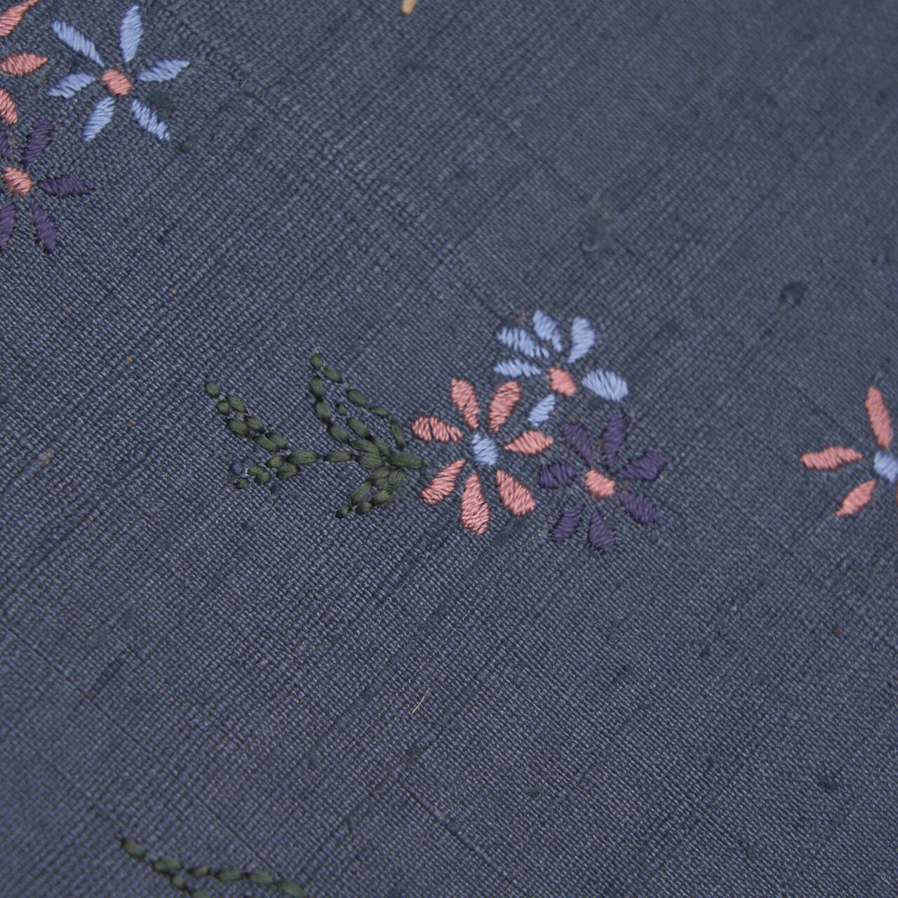 お花は二藍色の淡い赤紫、舛花色のブルー、青褐色の濃い紫、葉は鉄色の濃い緑で刺繍されていて、菊やサクラソウのようなお花やチューリップなども見られます。