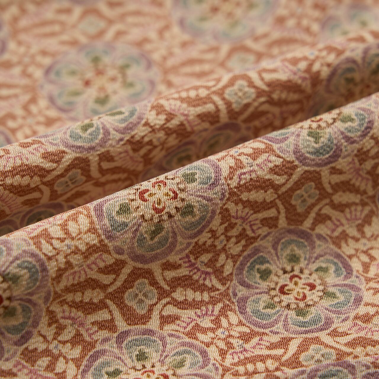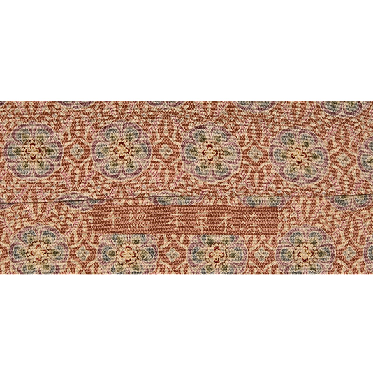 しなやかでしっとりとした質感の上質な一越ちりめんの生地が明るく淡い薄茶・土器色に染められ、そこに梅の花と思われる6辨の花と、その間に瓔珞のような飾り、そして小さな鳥を配した、正倉院裂にも見られる「花鳥梅花文錦」の模様が染め表された、格調高さの感じられる千總さんの素敵な小紋のお着物です。