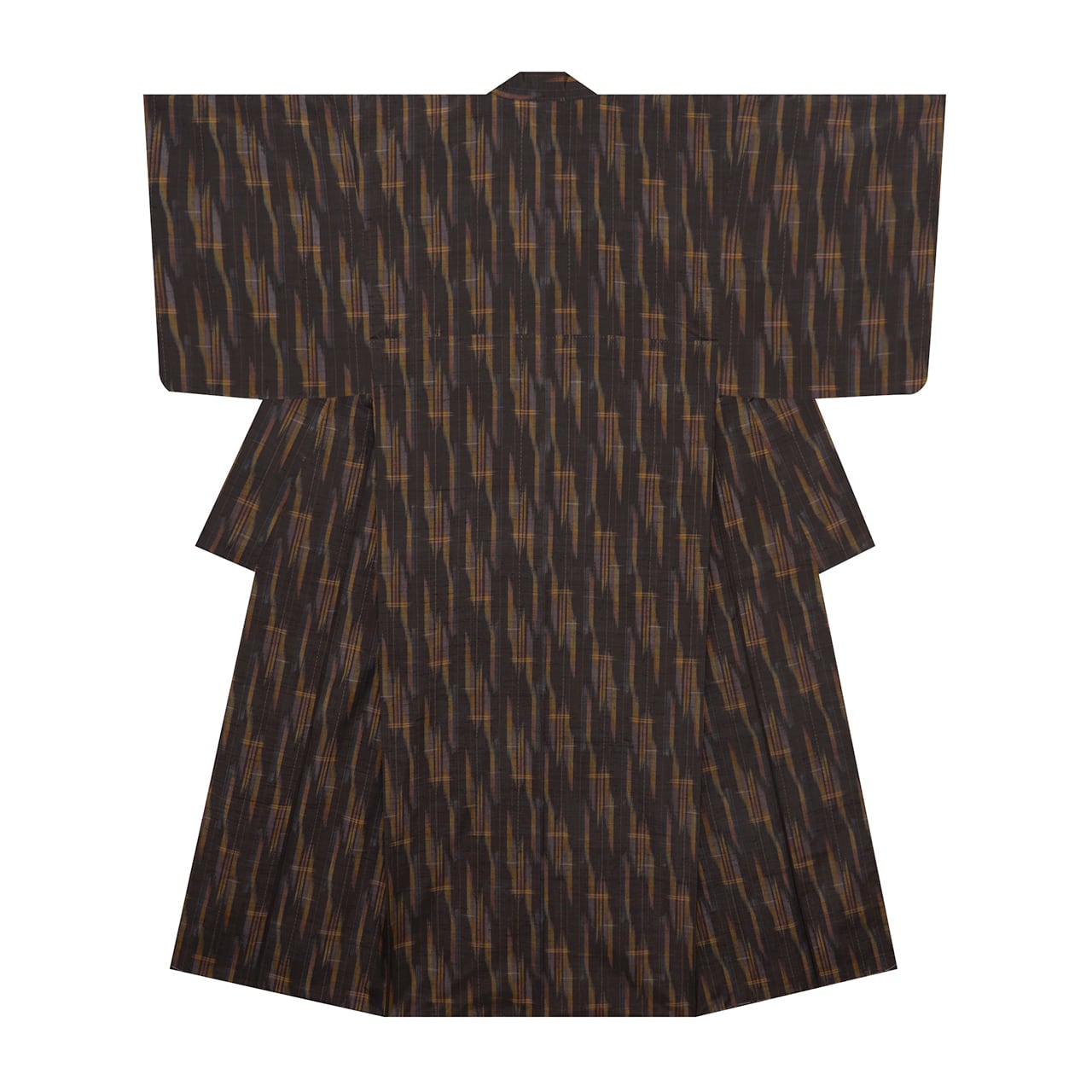 ほんの少しだけ赤味のある濃い焦げ茶・赤墨色のしっかりとした紬地に、手括りで染められたと思われる縦絣の糸が織り込まれ、その絣が全体には斜めの配置になるように並べられ、それを横切るように細い横絣の糸が交差したリズム感の感じられる模様と、手仕事の織物の味わいが混在するような、とてもお洒落な紬のお着物です。