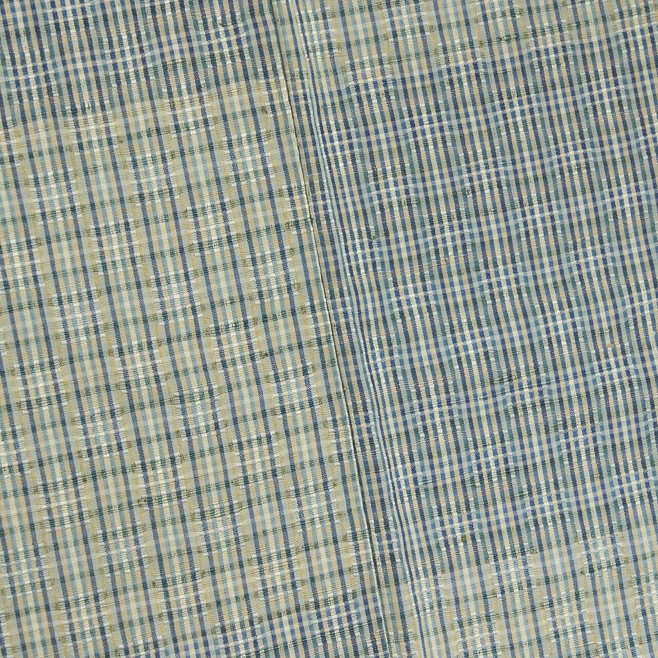 縦には淡い水浅葱色と、苅安であえて抑えて染められたというベージュ・亜麻色の2色をベースに、それにやや濃いめの藍・鉄御納戸色と、少し明るい藍・青碧色、天蚕糸の象牙色の縞が並んで織り出され、全体には段変わりに緯糸の色が変えられて、大きな市松の配置に濃淡が現れるように織られて、地織は約2cm角のロートン織のような浮き織がやはり市松の配置に織り出された、大変手の込んだ織りの作品です。