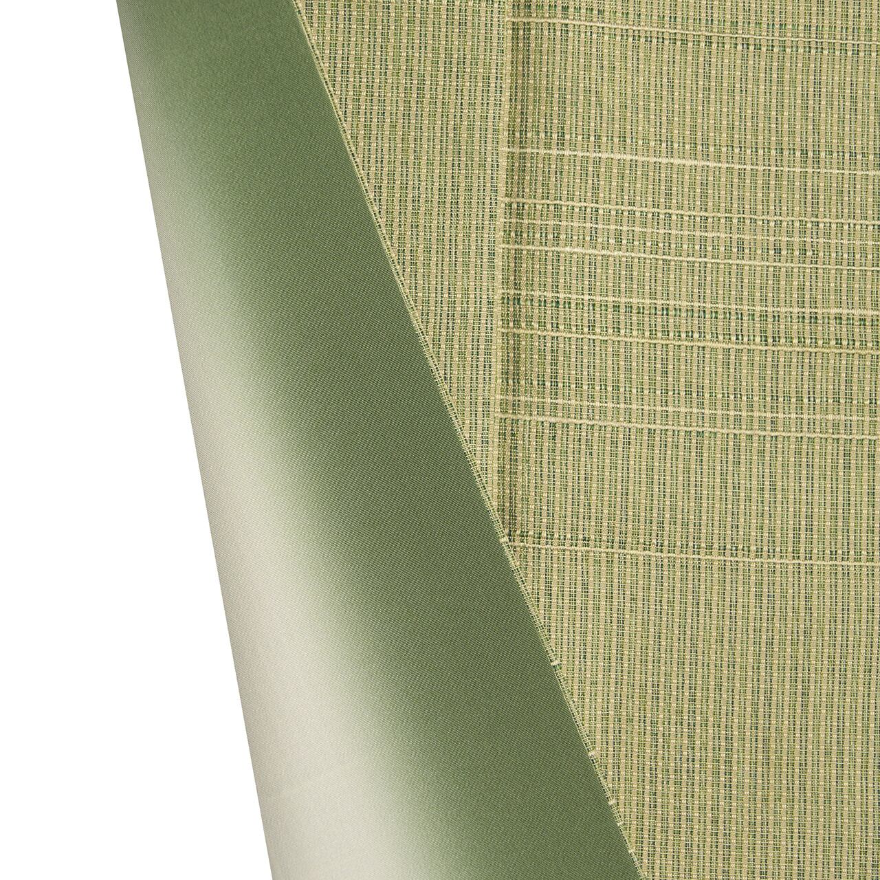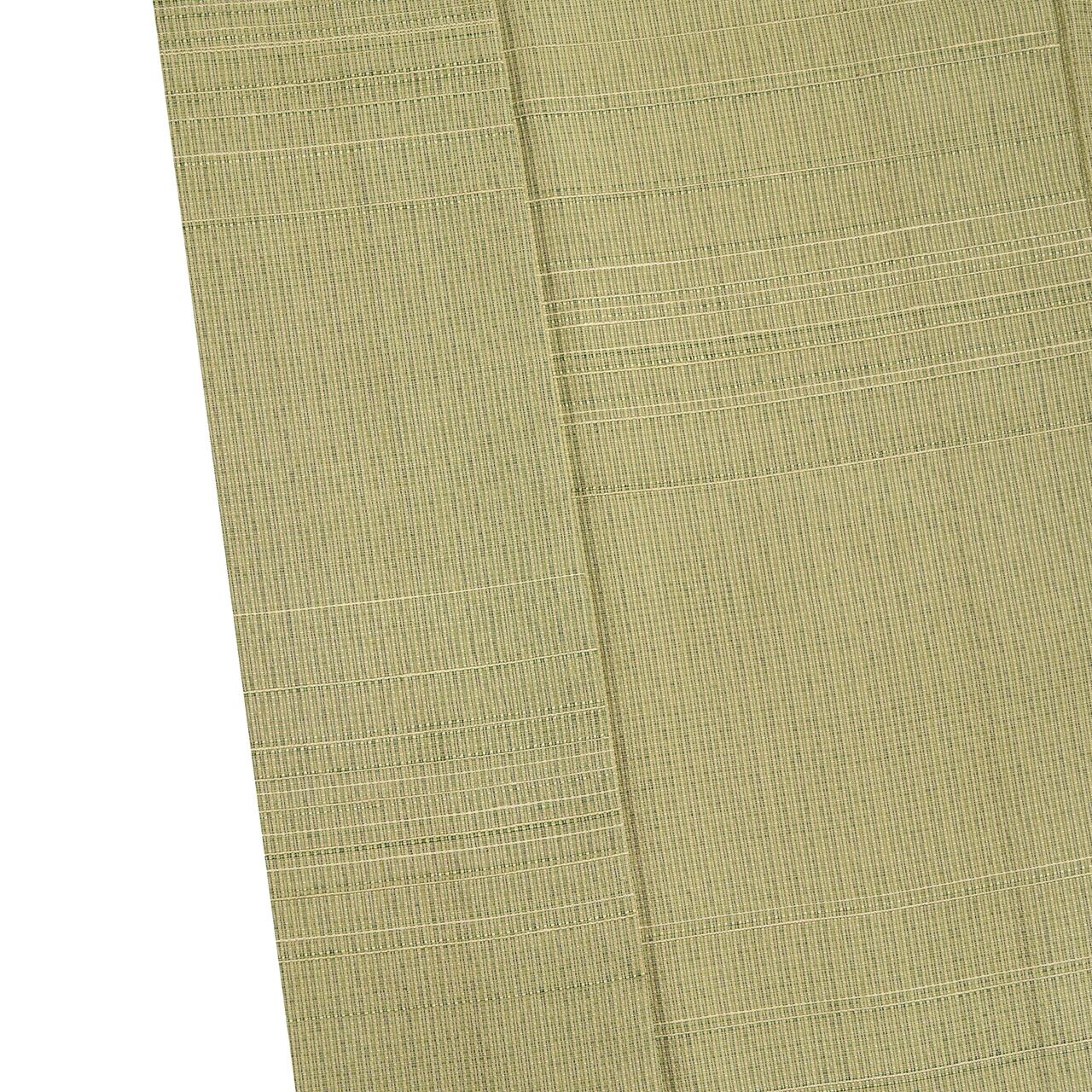 天蚕糸の明るく絶妙に深い味わいのある黄緑・柳茶色がとても素敵に織り出された趣のある細縞に、段変わりの横縞が入れられた、本当にお洒落な無地感覚の紬のお着物です。