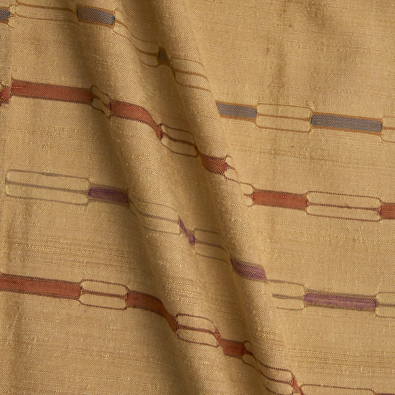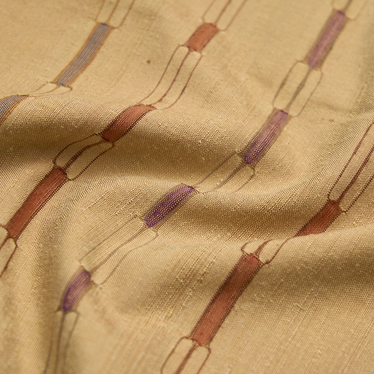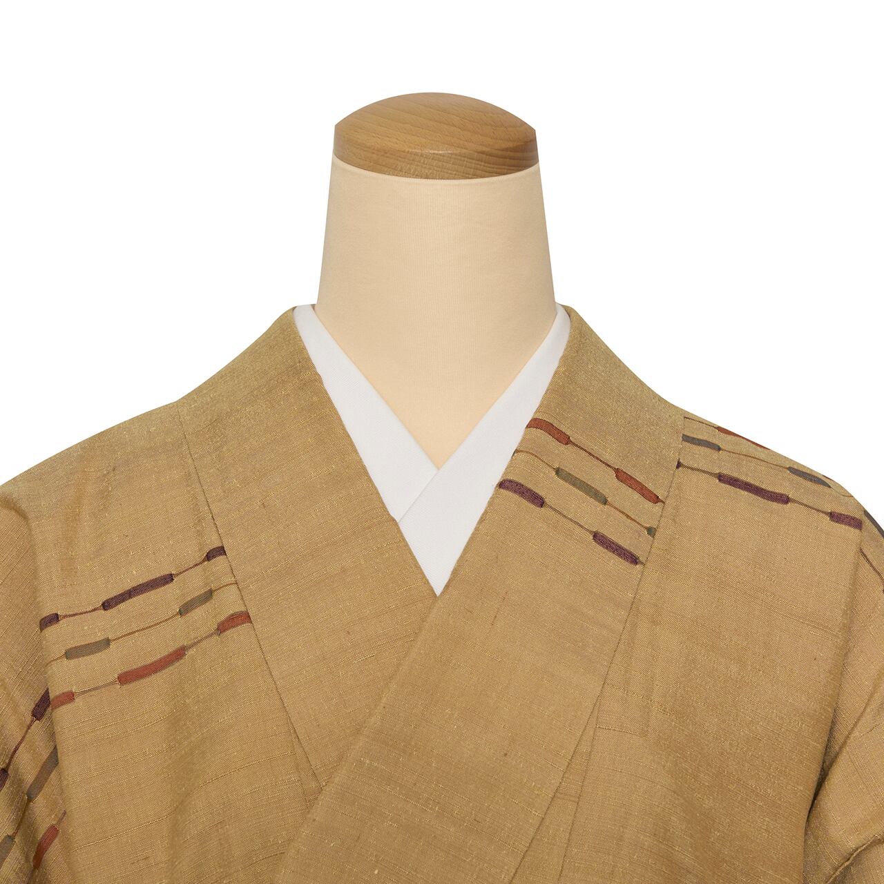 やや明るいオレンジ味のあるベージュ・白茶色の地に、源氏鼠色や柿渋色、葡萄鼠色、似せ紫色などで様々な長さのめがね織が織り込まれ、それが絵羽附けの配置となって、少し格高な印象となったお洒落な紬のお着物です。