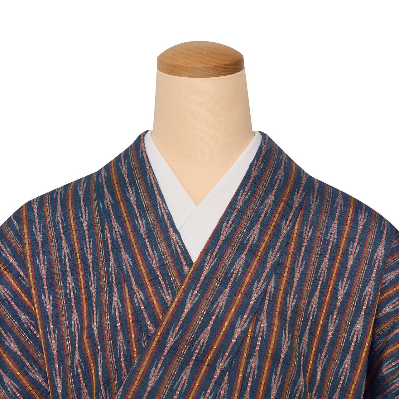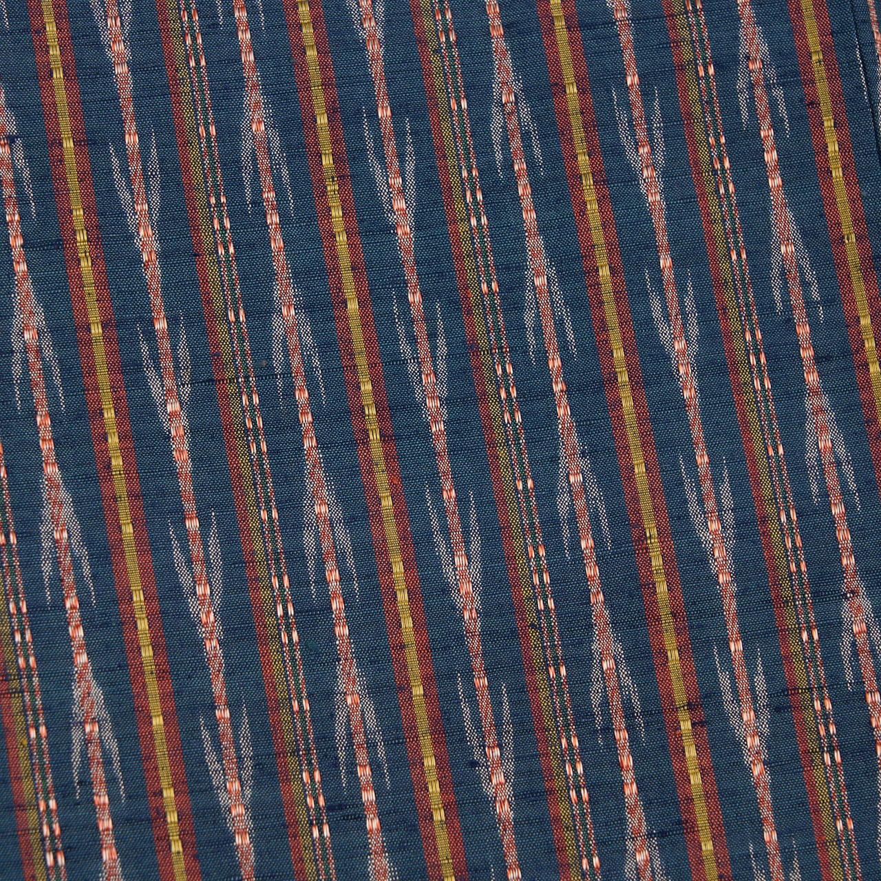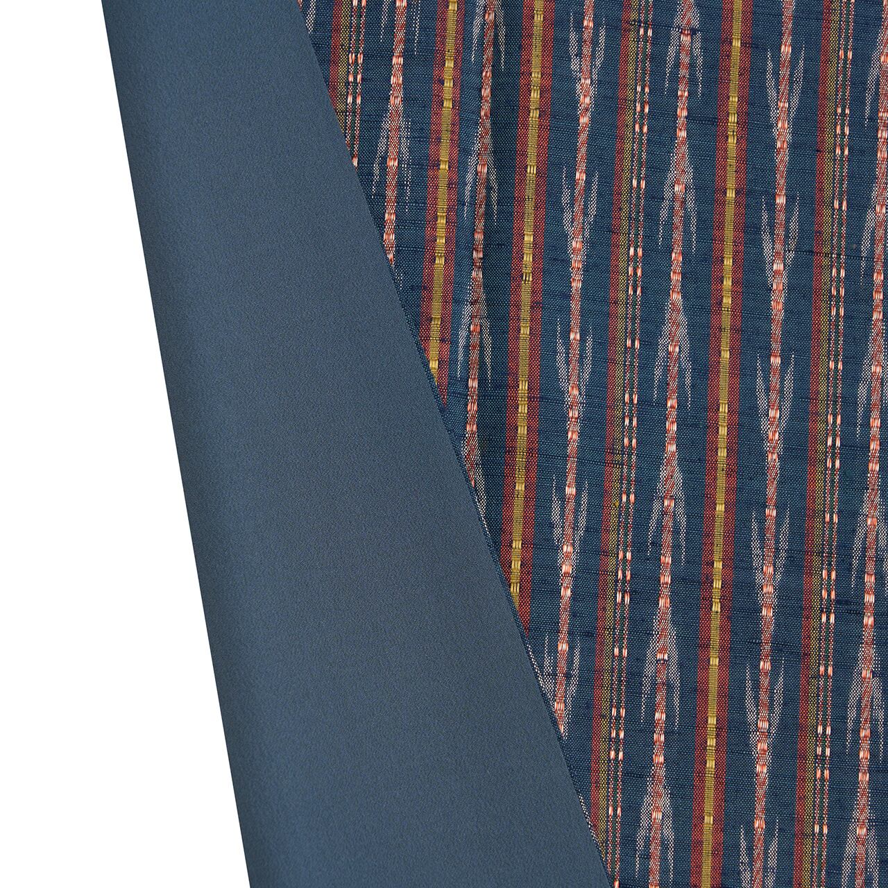藍色の地にいろいろな色の縞や絣が織り込まれていて、特に矢絣の行き交う模様などに流れがあり、活き活きとしたフレッシュな印象で、その中でも撫子色のロートン織がとても存在感を発揮しているようです。