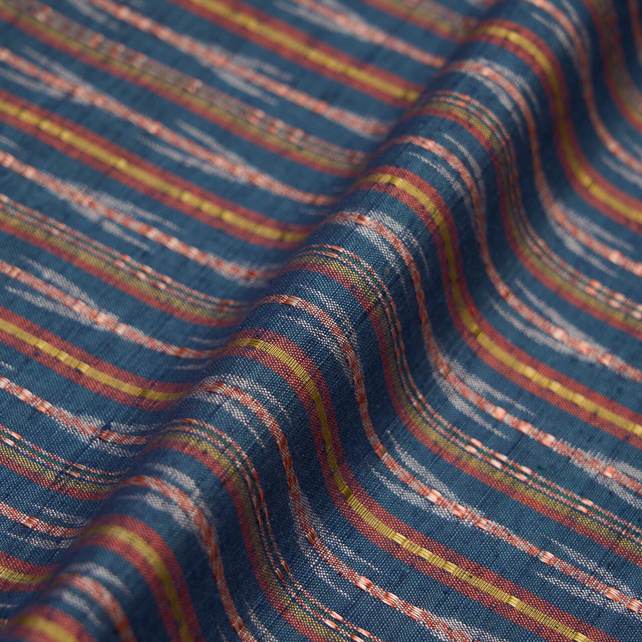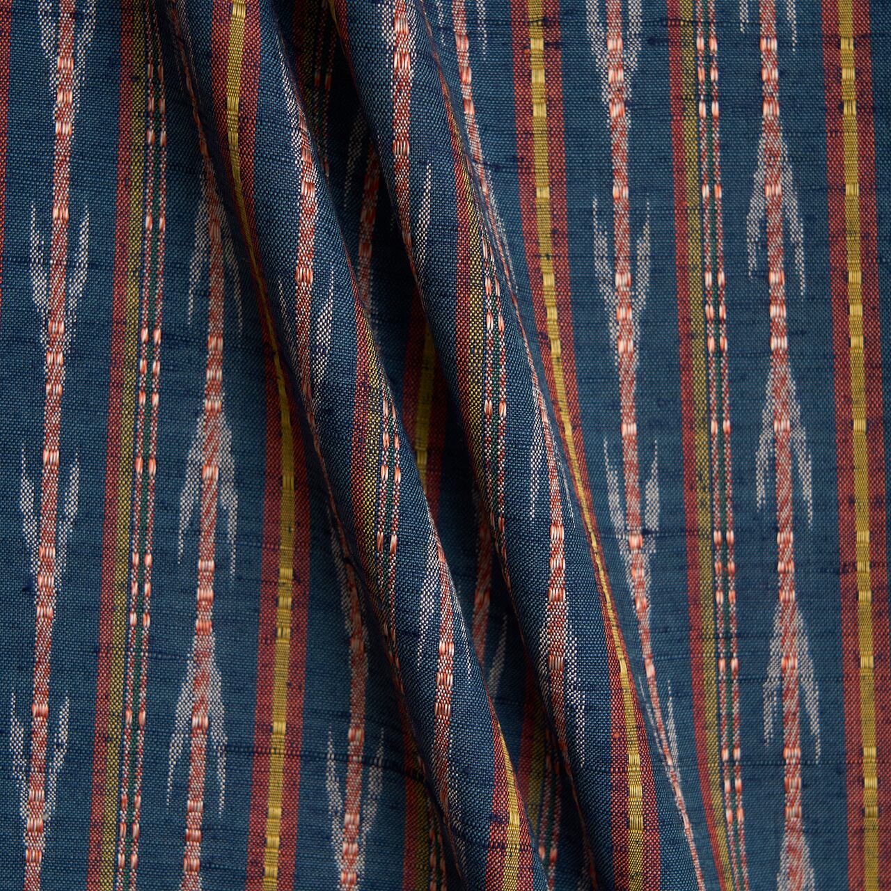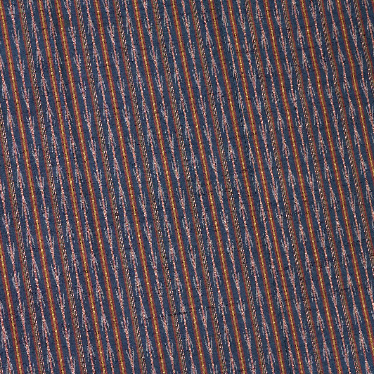 藍色の地にいろいろな色の縞や絣が織り込まれていて、特に矢絣の行き交う模様などに流れがあり、活き活きとしたフレッシュな印象で、その中でも撫子色のロートン織がとても存在感を発揮しているようです。