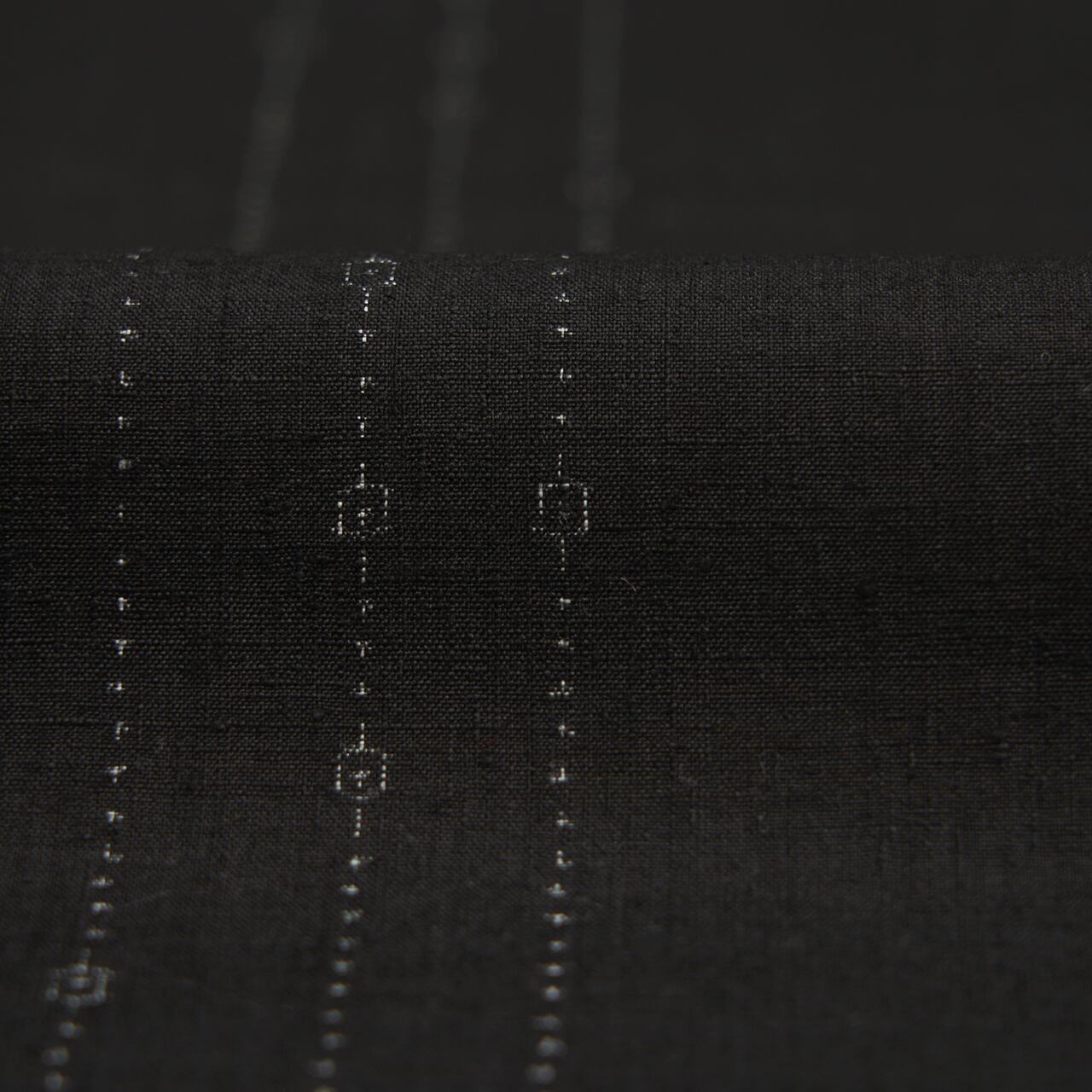 無地感覚的な模様ですが、とても小さなカ絣が並んで構成された独鈷のような線がひと幅の中に3本走り、そのところどころに100亀甲の大きさの亀甲が置かれたデザインとなっています。