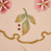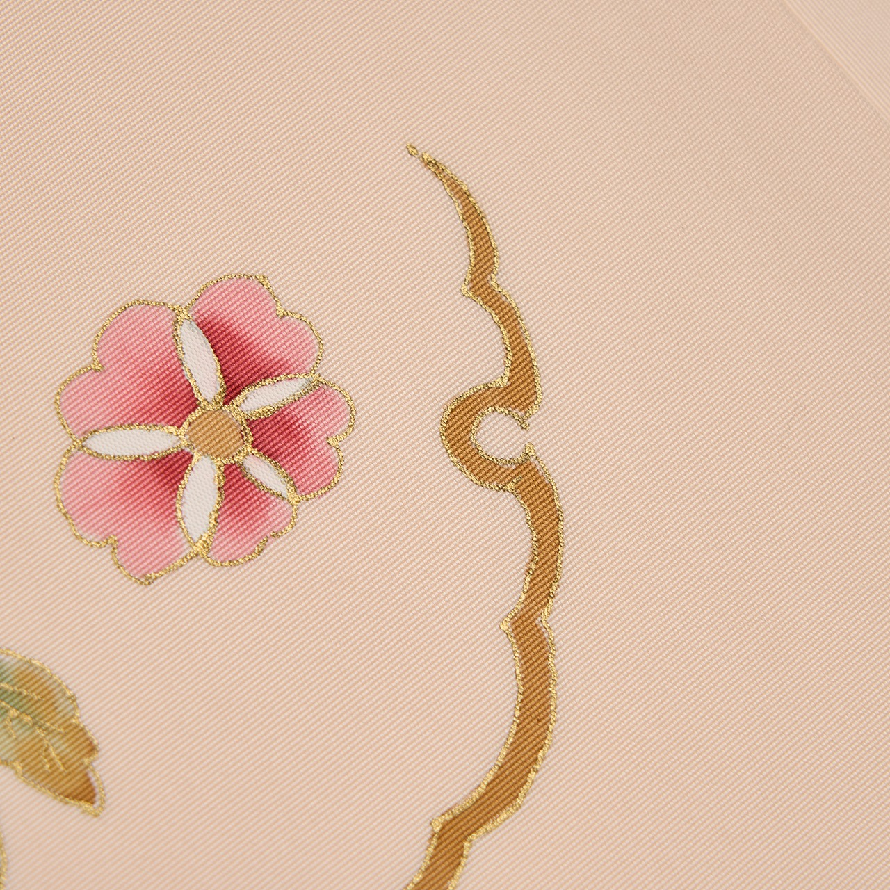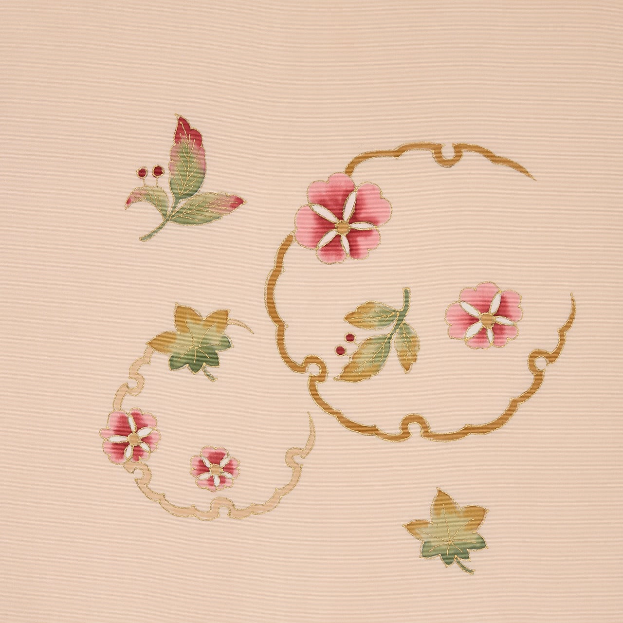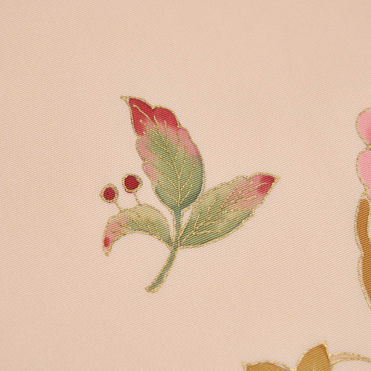 淡くやさしいピンク・灰梅色の塩瀬の生地に、お太鼓には黄橡色の濃淡で雪輪の形が取られ、その中に5枚の花びらの可愛いお花と、ヤブコウジのような赤い実をつけた草、紅葉の葉が友禅で描かれた、清楚な雰囲気で品の良い二部式の九寸名古屋帯です。