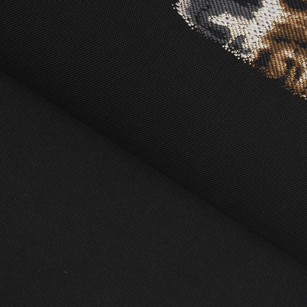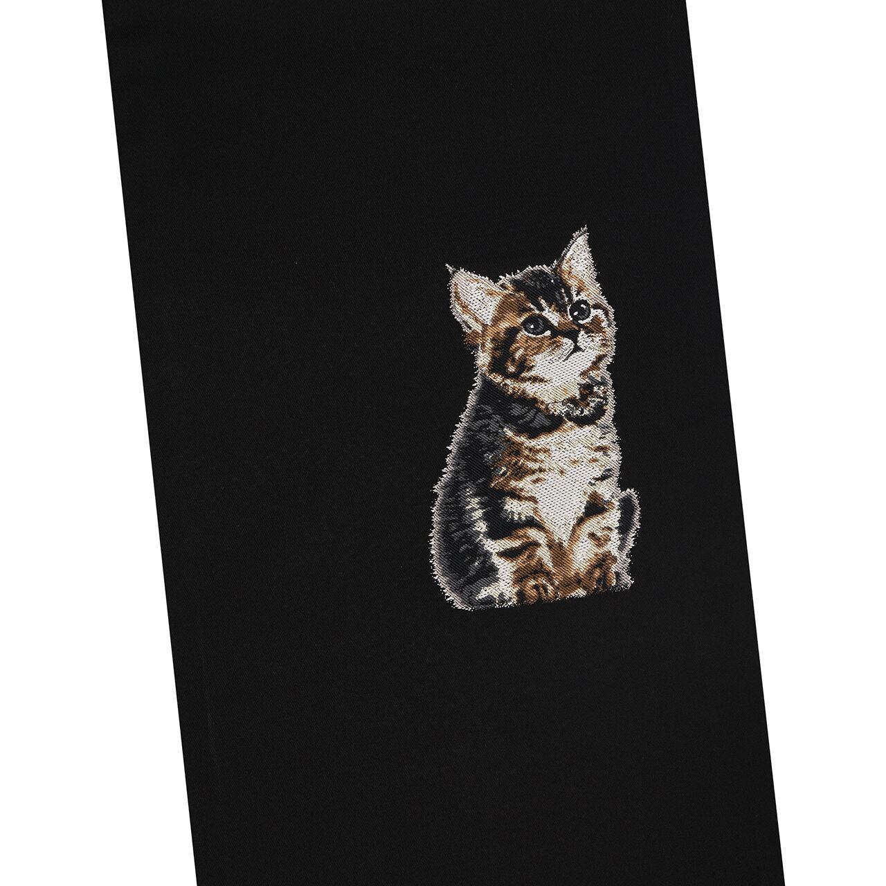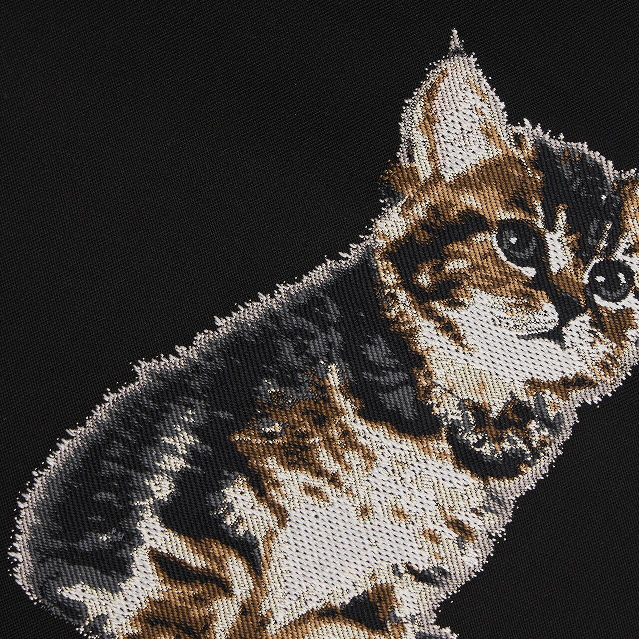 黒のさらっとしたしなやかな生地のお太鼓に、少し焦げ茶色の混じった、グレーのキジ模様の仔猫が、うるうるした瞳で何かを訴えかけているかのような可愛らしい姿が織り出された、とても素敵な九寸名古屋帯です。