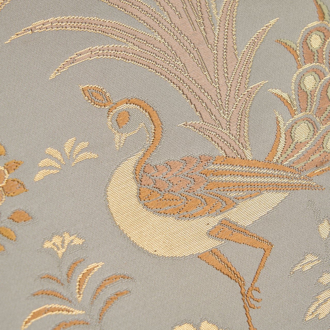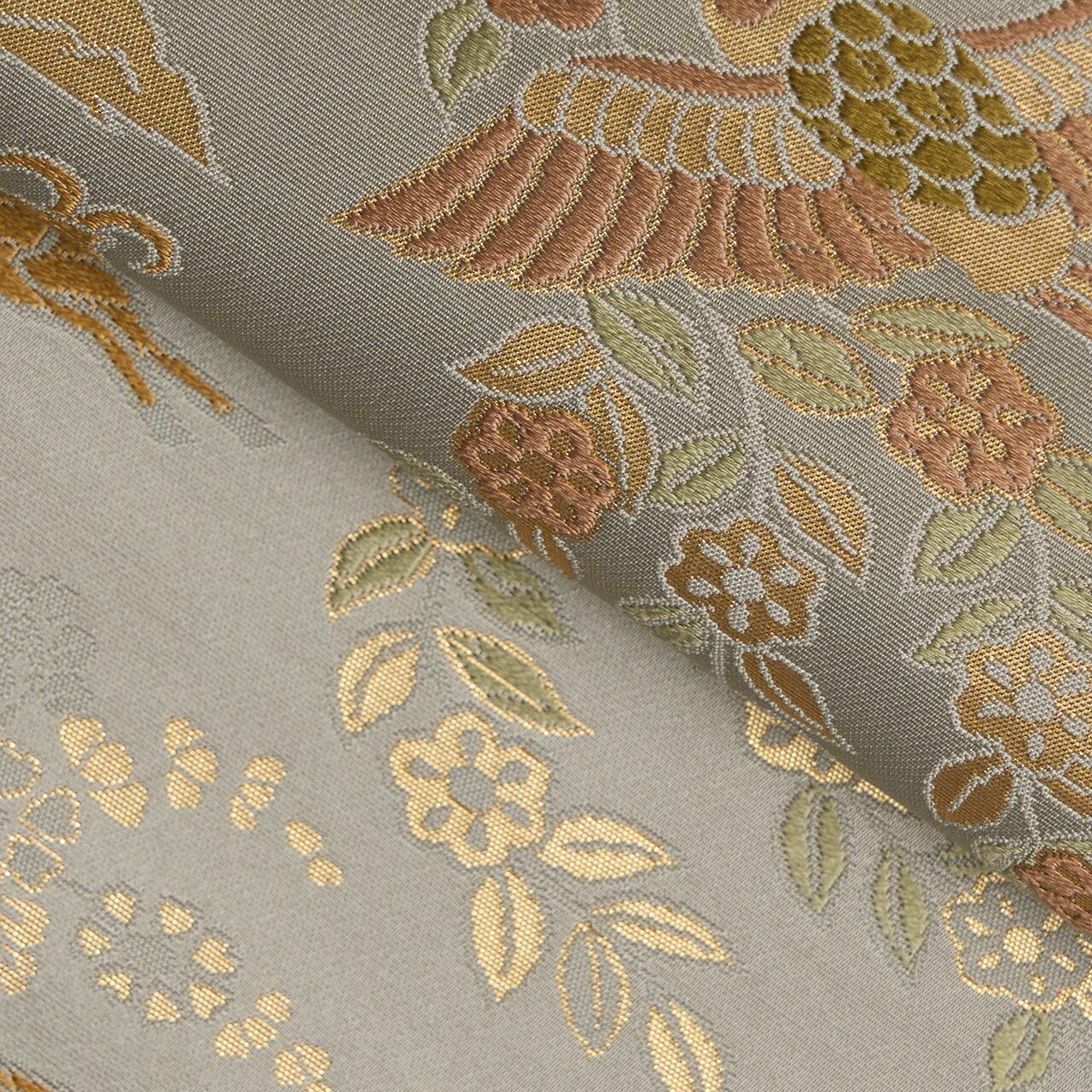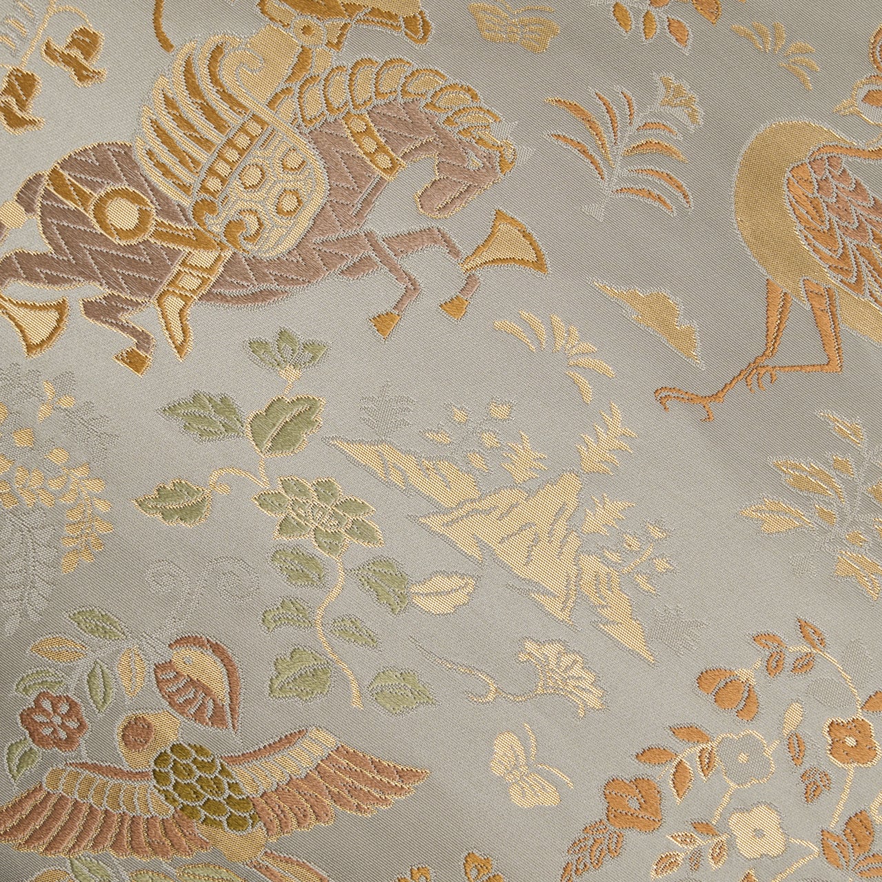 クールな印象の澄んだグレー・絹鼠色の地に、岩や草花が咲く草原のような場面と、そこに馬上で矢を放って駆けている人物や、安らいでいる鹿の姿、孔雀や鴛鴦、花喰い鳥などの正倉院文様のモチーフがたくさん盛り込まれて、極細の金箔の糸と草木染の糸とを交えながらボリュームたっぷりに織り出された、格調高さのある袋帯です。