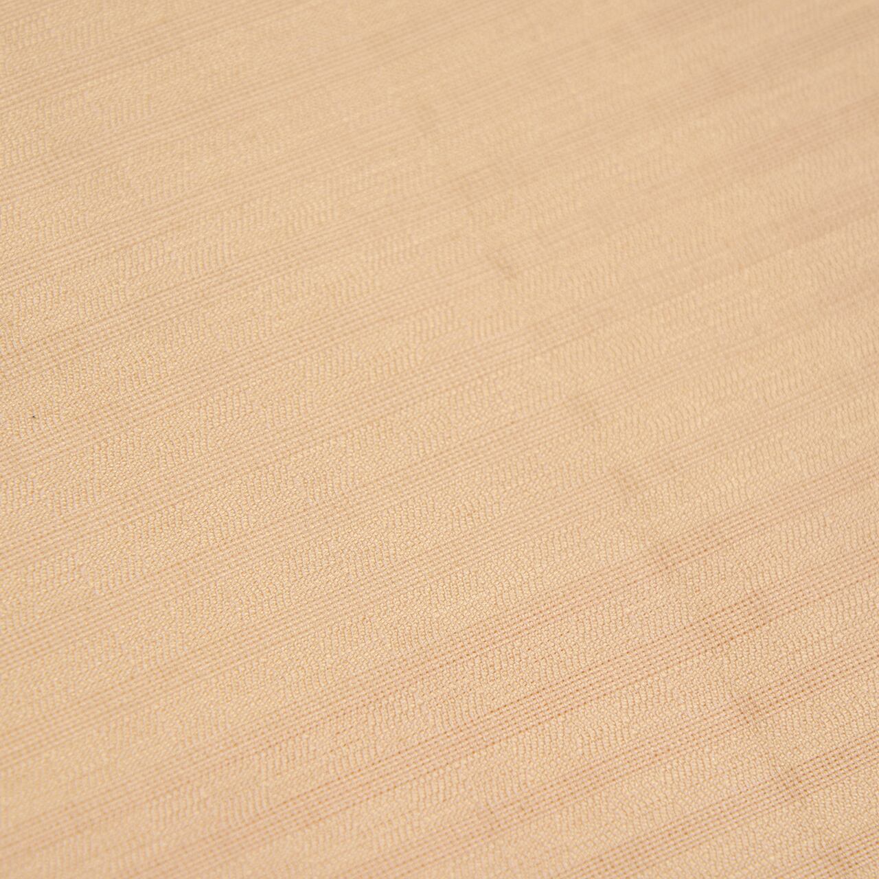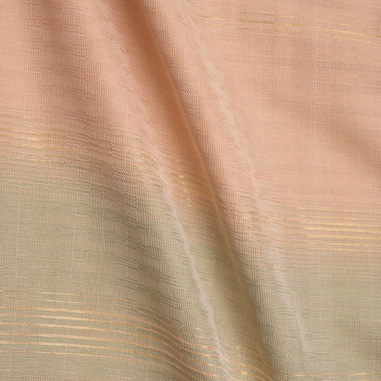 オレンジ味のある淡いピンクベージュ・灰梅色の地に、うっすらと横縞のような地模様があり、裾には水柿色、青白橡色そして胡桃染色の段が取られ、暈しで織り分けられたところに極細の金糸が織り込まれて、華やかさを添えています。