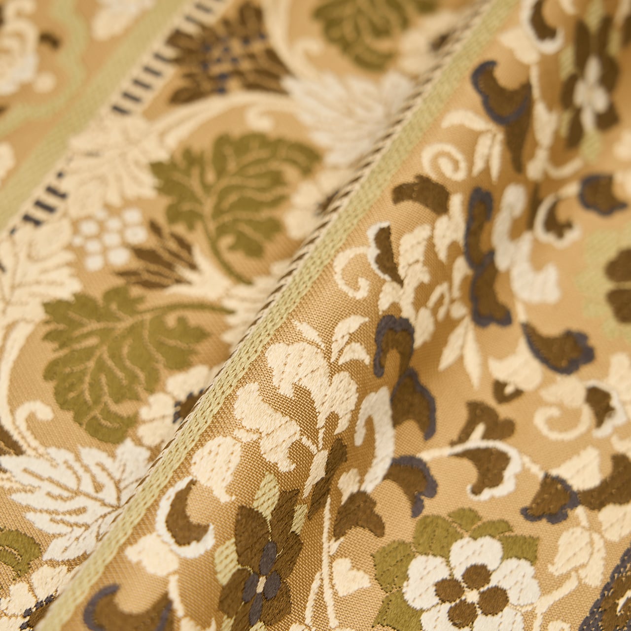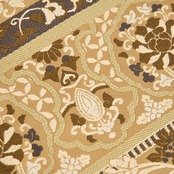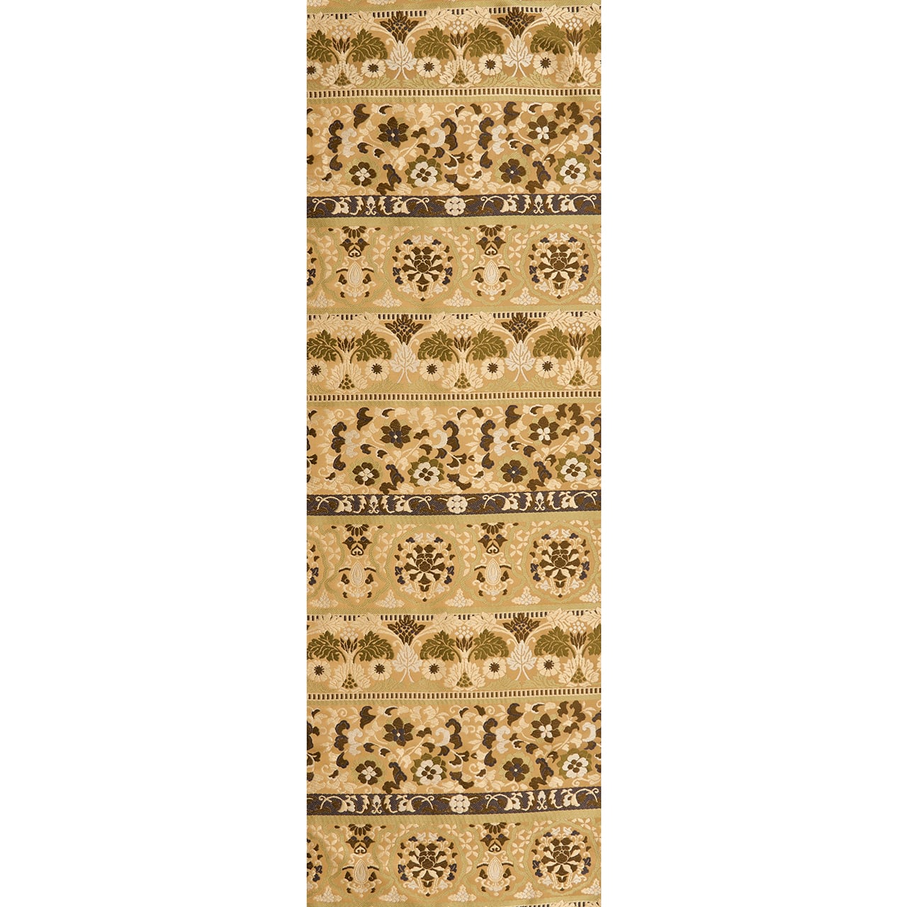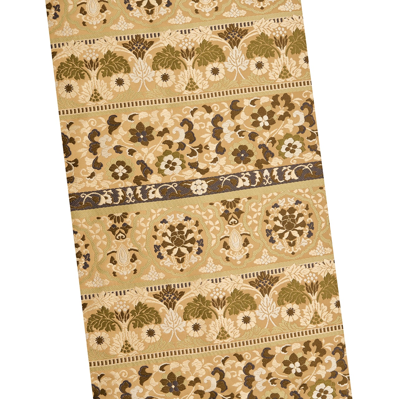 とても綺麗でクリーミーな印象の薄茶・白橡の地に、練色や老竹色のモスグリーン、涅色の焦げ茶の濃淡、山葵色の淡い緑などの糸で、花唐草やペルシャ花文のような模様、丸にお花の模様などが段変わりに唐織で織り出された、少しオリエンタルな雰囲気のあるお洒落な全通の本袋帯です。