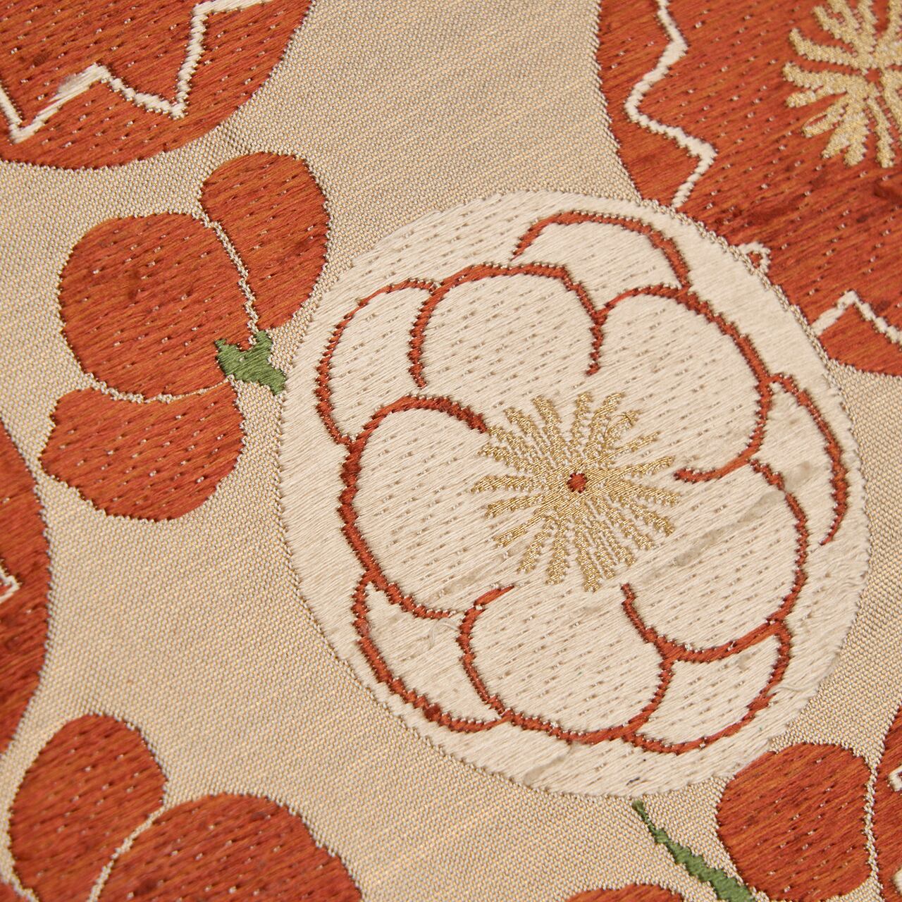 淡いベージュの糸に、極細の金箔の糸が織り込まれて少し光沢のある白橡色に織られた地に、たくさん並んだ中型の大きさの丸の8割くらいが紅鳶色の糸で、残りは生成り色の糸で織られて、ところどころに蕾も見えるような紅白の梅のお花が表された、とても洒落たデザインの手機の本袋帯です。