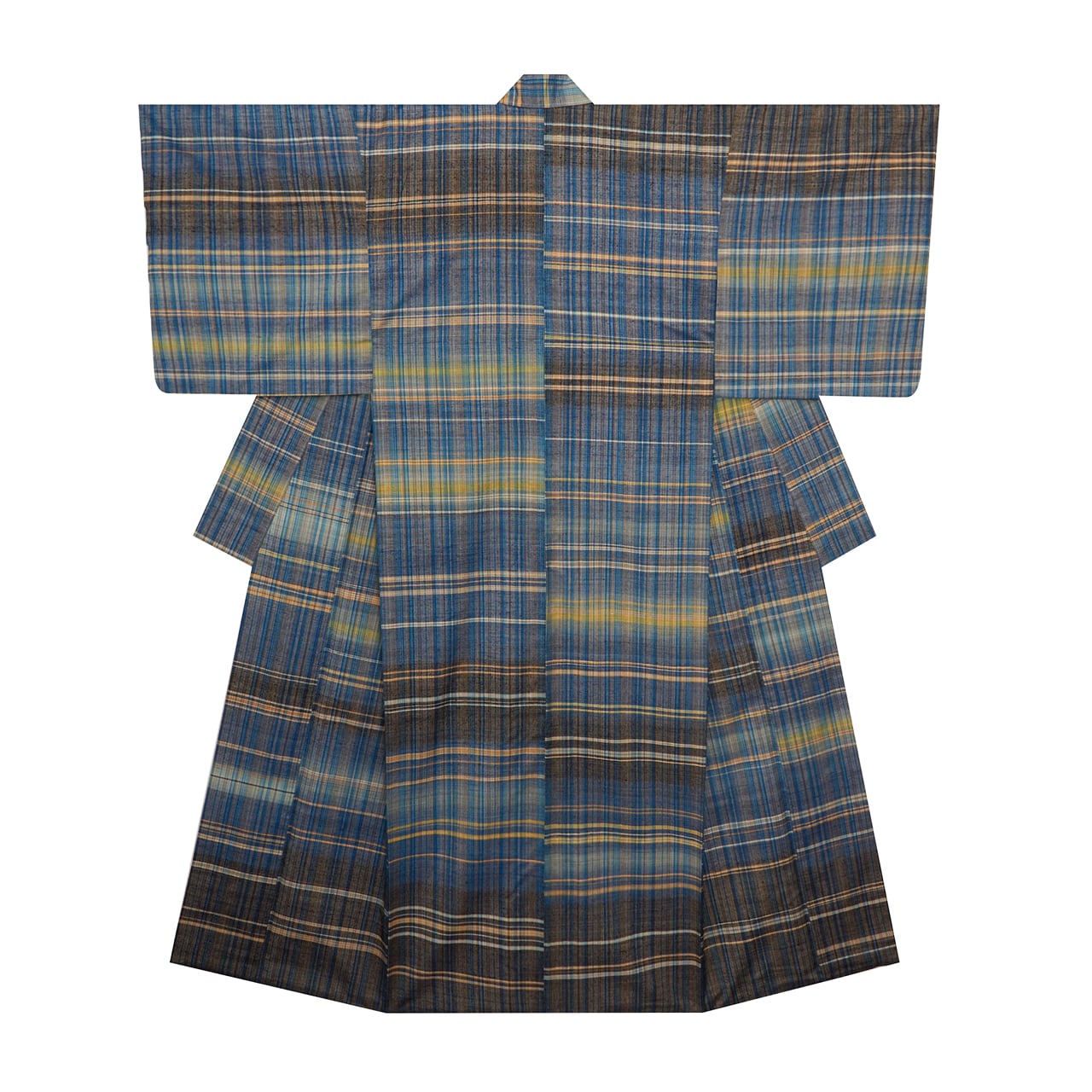 少しグレー味のある中間の藍染の色・紺鼠色を主にして、草木染で染められたいろいろな色の糸が、縦に横に巧みに配置されて織り出され、味わいのある格子の模様を織り成している、素晴らしい手織りの絵羽紬のお着物です。