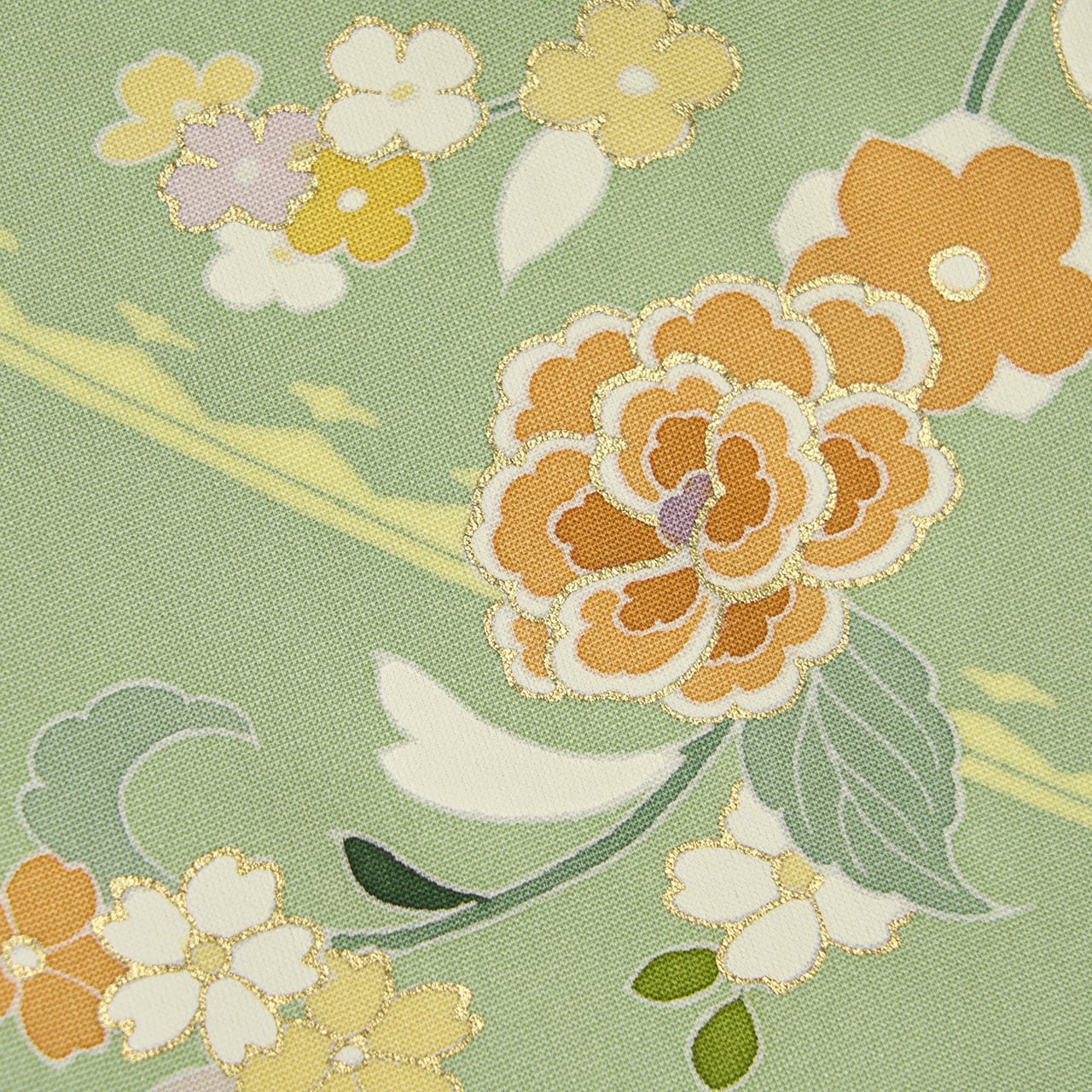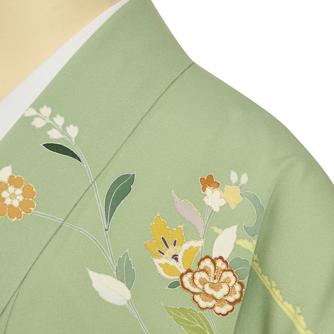 澄んだ綺麗な淡い若草色・若葉色に染められた、しっかりとした国産の一越ちりめんの生地に、風になびくように模様を横切るリボンが明るい黄色・枯草色で描かれ、裾から湧きあがるように咲く唐花の模様が綺麗な明るい朱色・浅緋色を中心にして、白橡色や柑子色、そして胡粉色の白で、美しい手描きの友禅で描かれ、金彩や手刺繍も施された、素晴らしい千總さんの訪問着のお着物です。