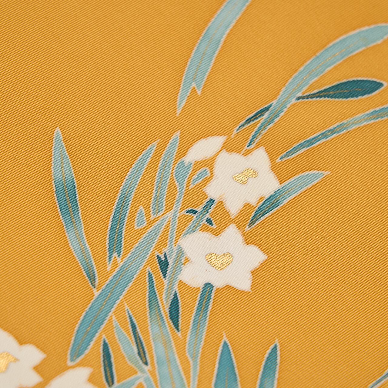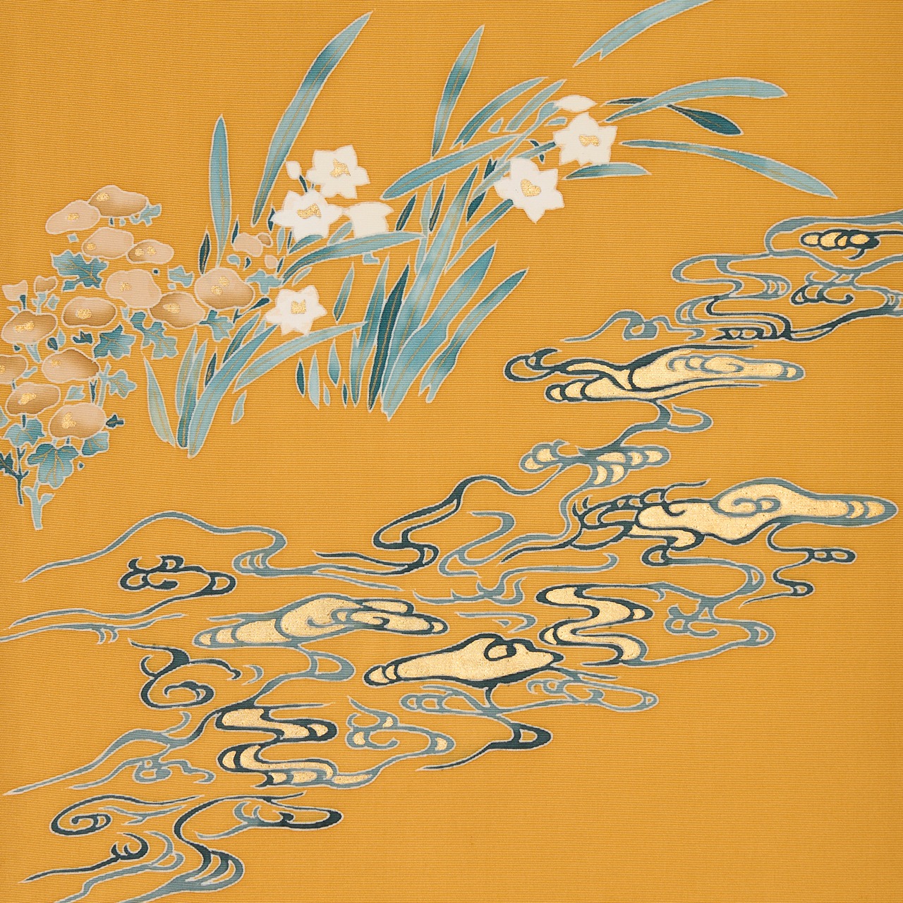 豊かさの感じられるこっくりとした黄色の地に、グレー味のある藍色の濃淡で描かれた流水の模様もとても雰囲気が良く、ところどころに金箔の加工も施され、雅で情緒のある素敵な図案となっています。