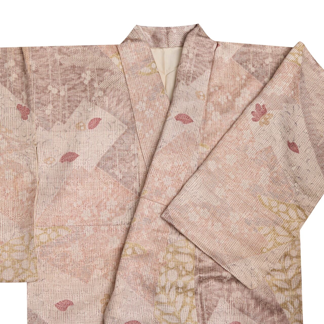 細い木の枝が生い茂るように張り巡らされたところに、小さな紙吹雪が舞っているような地模様のある紋綸子の生地に、裂取りの模様が取られ、桜のお花が咲いていたり、木の葉が茂っていたり舞っていたり、辻が花のように少し墨で模様が入れられていたりと、いろいろな模様が染められ、そこに柳絞りの技法で絞り染めが加えられて、少し複雑なニュアンスのある表情となった、千總さんのお洒落な小紋のお着物です。