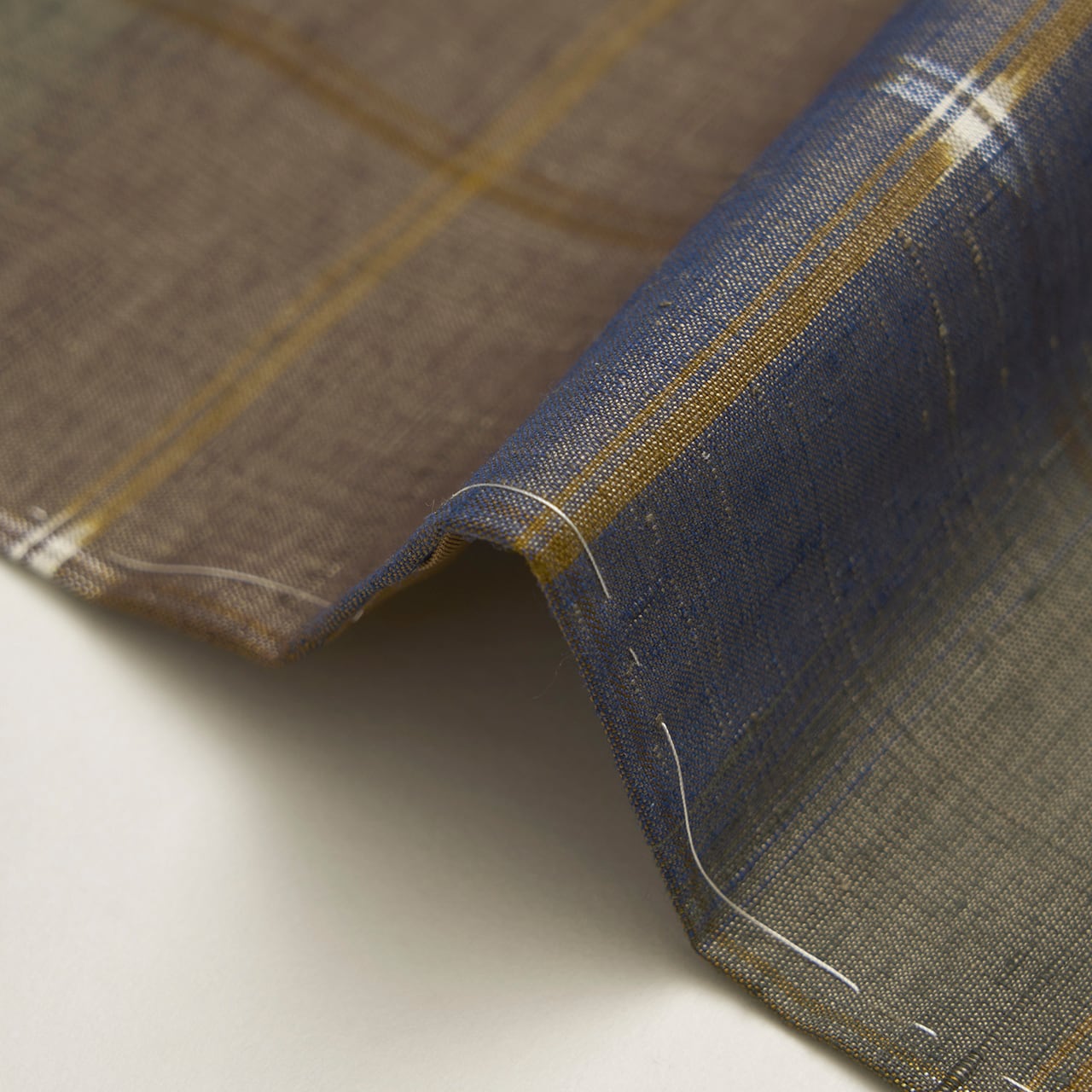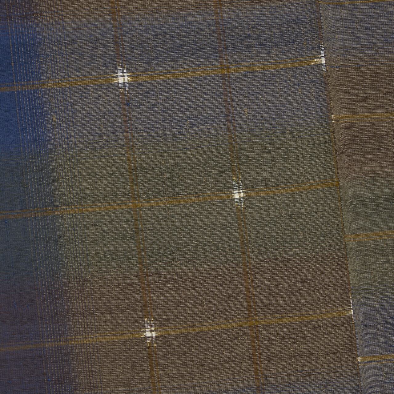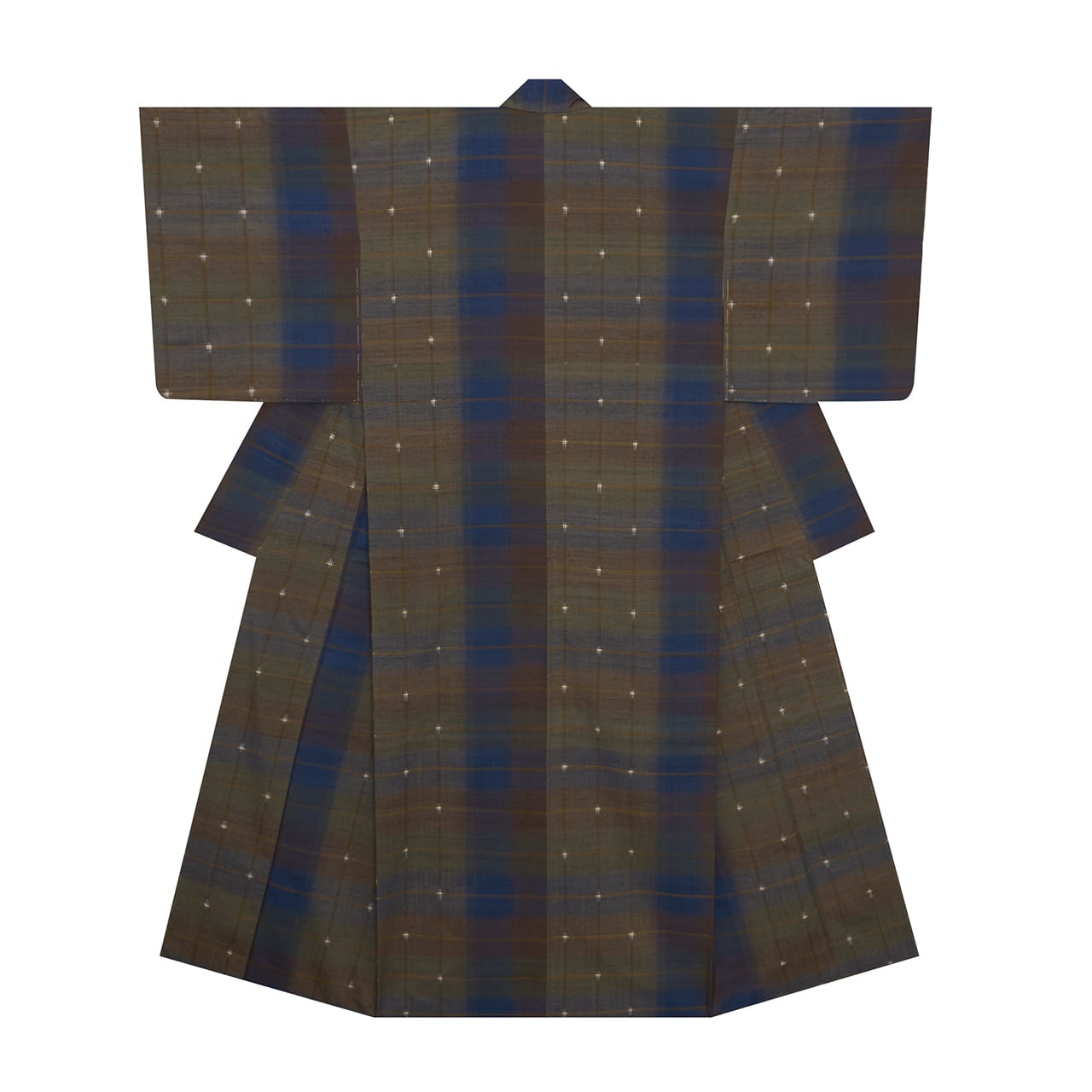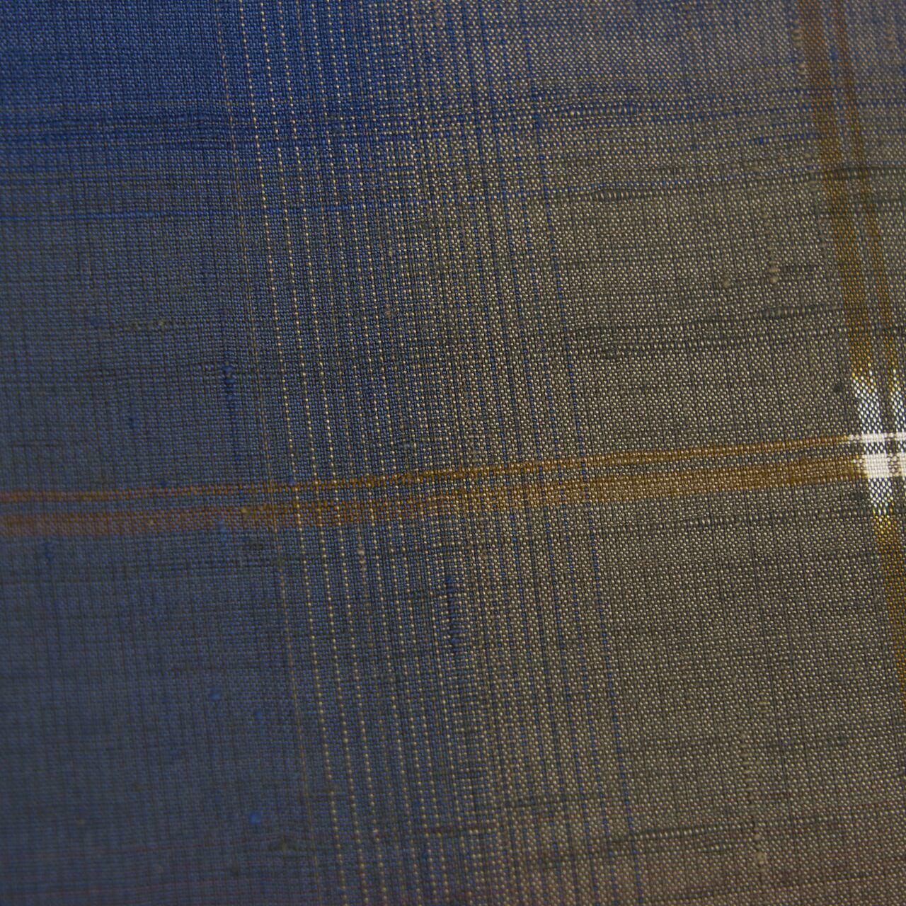 横段の微妙に違う色の暈しの縞が表された絣の糸の染めだけでもとても手が込んでいますが、縦にも藍色の暈し縞が織り出されて複雑な色合いを醸し出して、それにさらに重なるように配置された路考茶色の格子模様がある事で少しキリッとした雰囲気になっています。