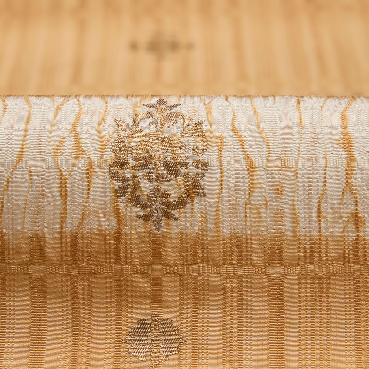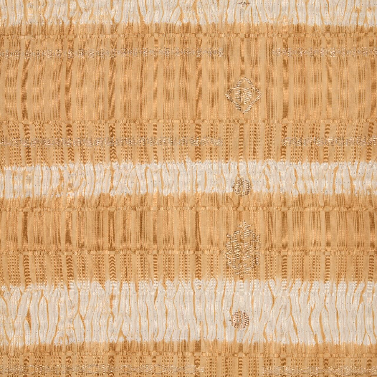縦に長い形に織り出された吉野格子の地模様に、横縞のように金箔の糸が織り込まれ、半分より右寄りの位置に大小のお花のような形が金襴のように織り出された帯地が、淡い黄色味のあるオレンジ・淡香色地に染められ、段変わりに幅を変えながら縫い絞りで白く染め抜かれた、大変手の込んだお洒落な袋帯です。