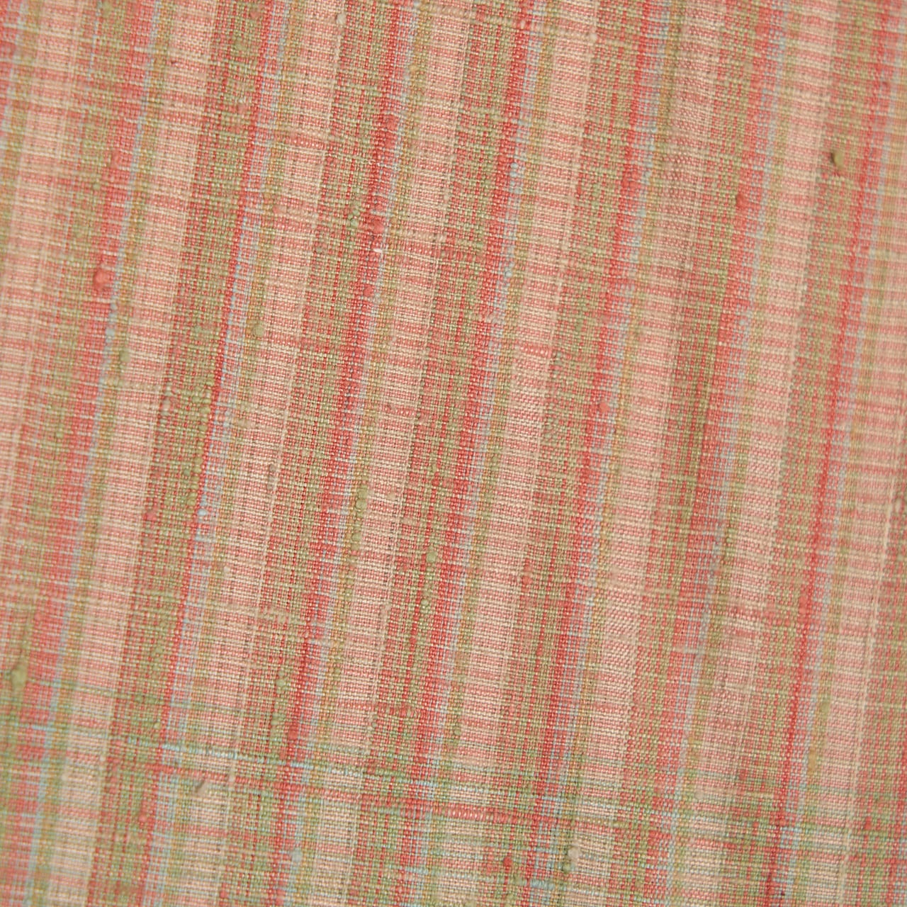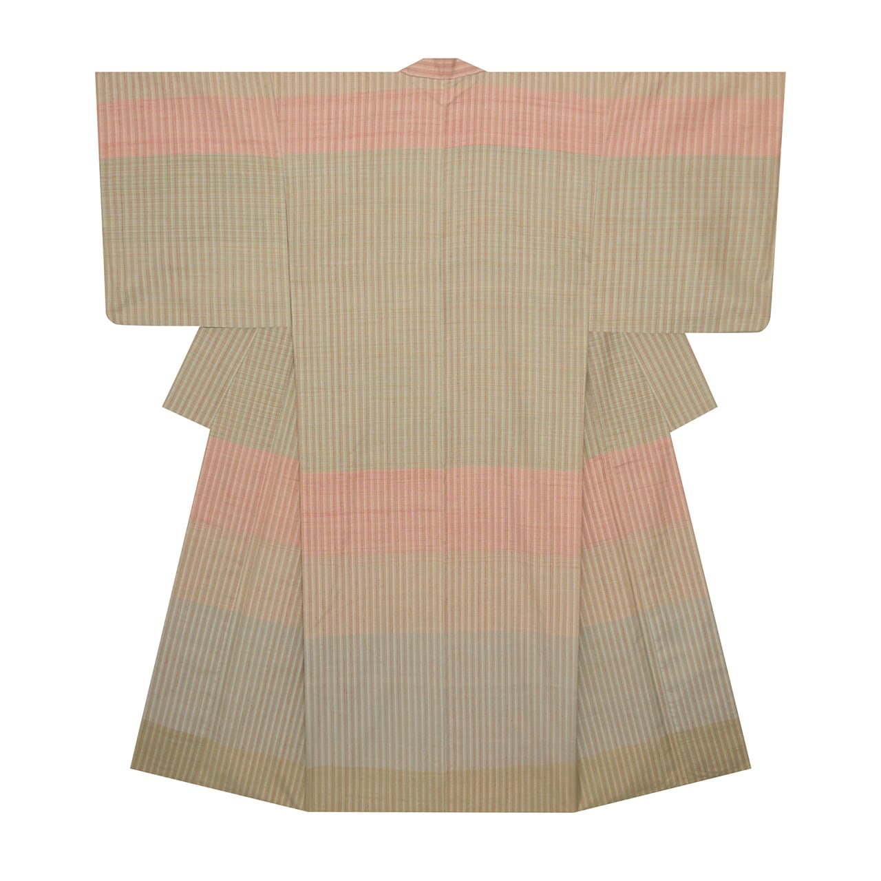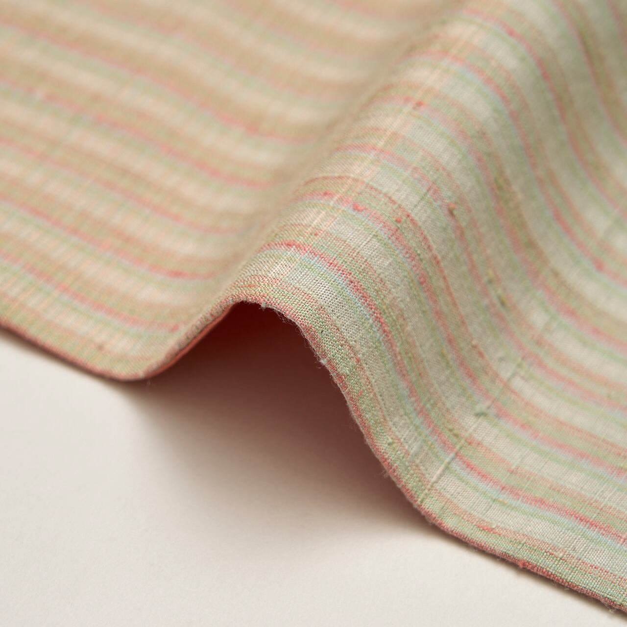 小鮒草で染められたと思われる淡いベージュ・亜麻色をベースにして、藍で染められた水浅葱色と、山岸さんならではの濃い紅花色などが縦の縞を構成しています。