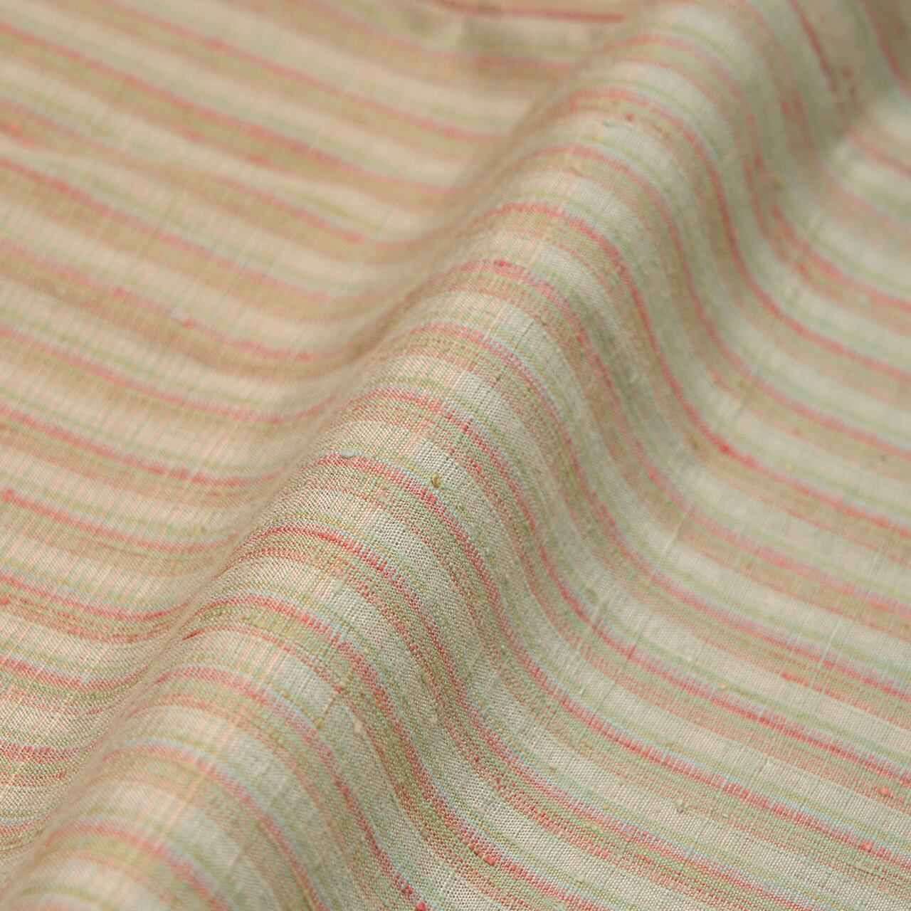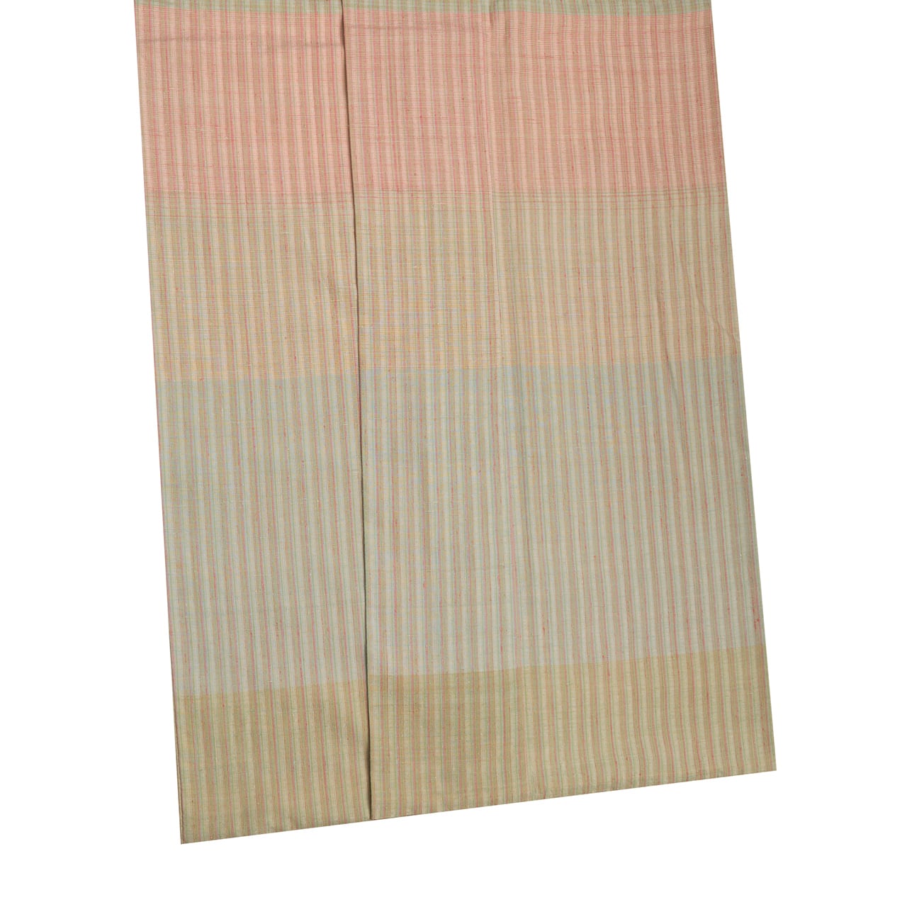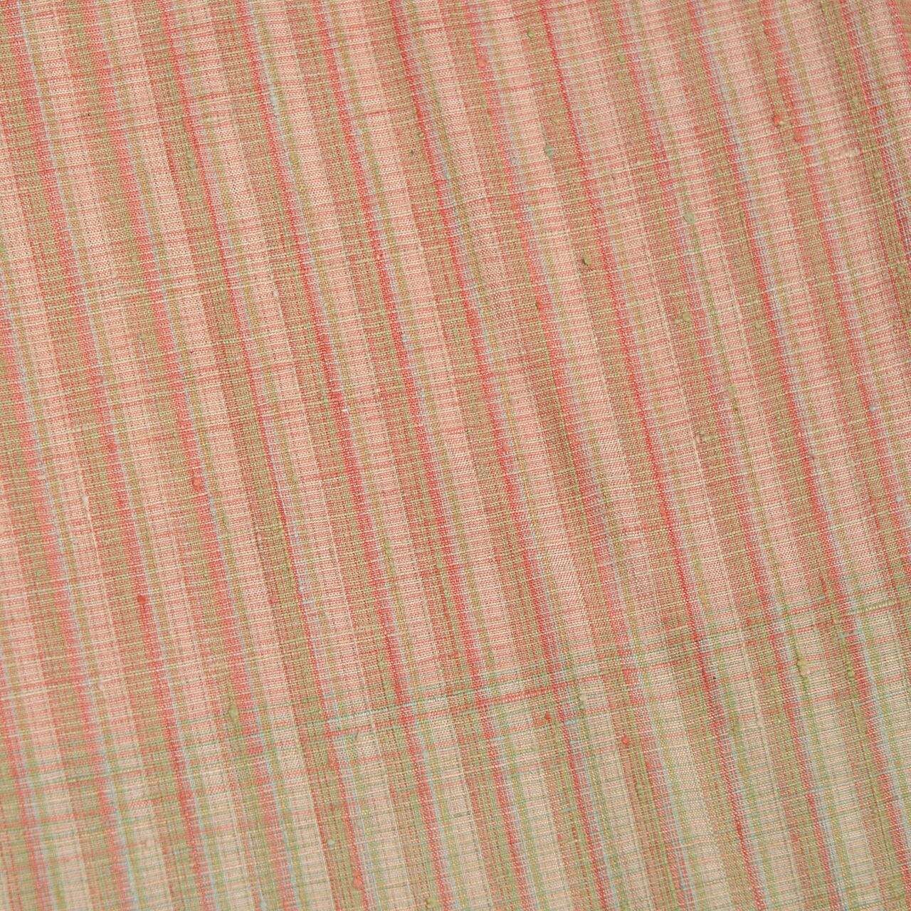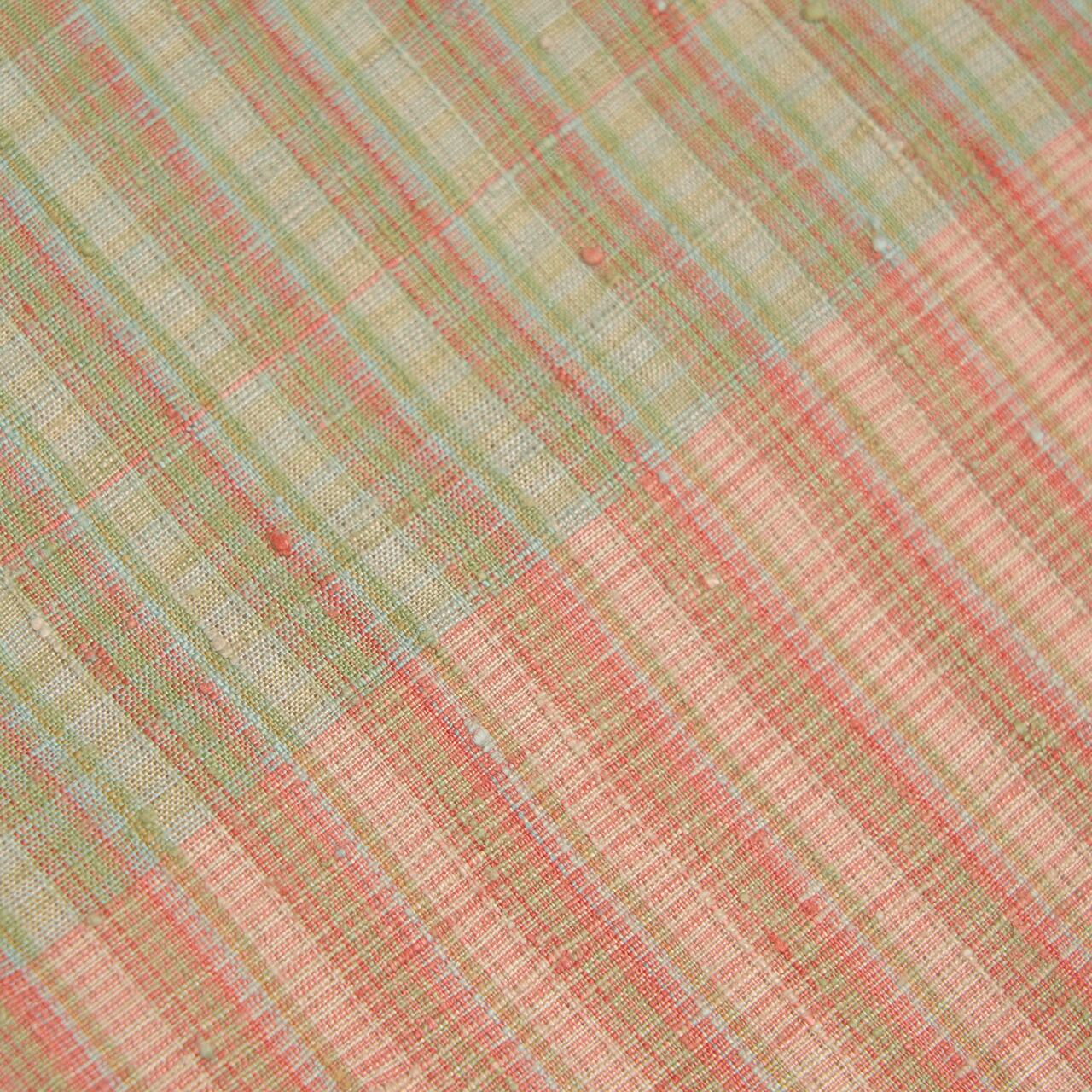 小鮒草で染められたと思われる淡いベージュ・亜麻色をベースにして、藍で染められた水浅葱色と、山岸さんならではの濃い紅花色などが縦の縞を構成しています。